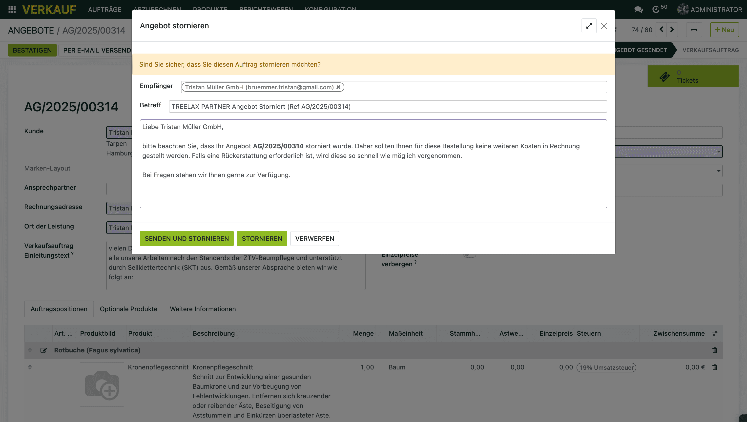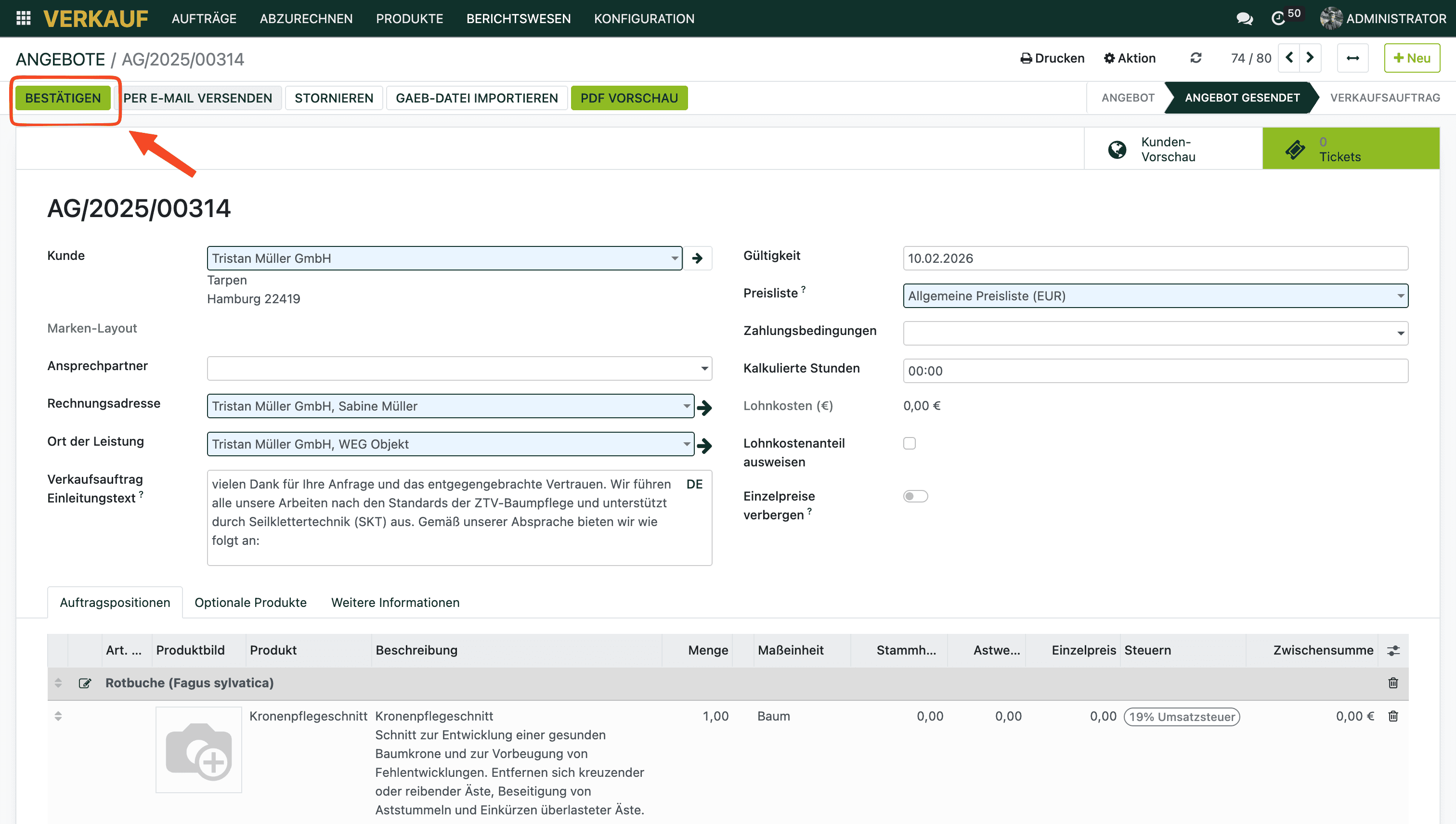 Öffne das Angebot (über die Anfrage-Kachel oder direkt über Verkauf → Aufträge)