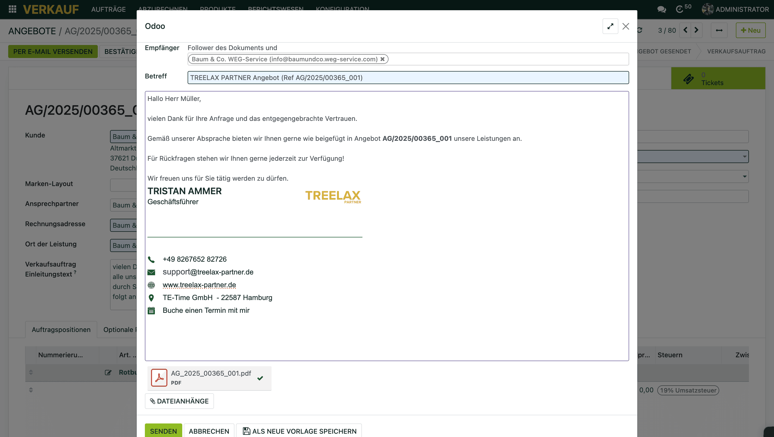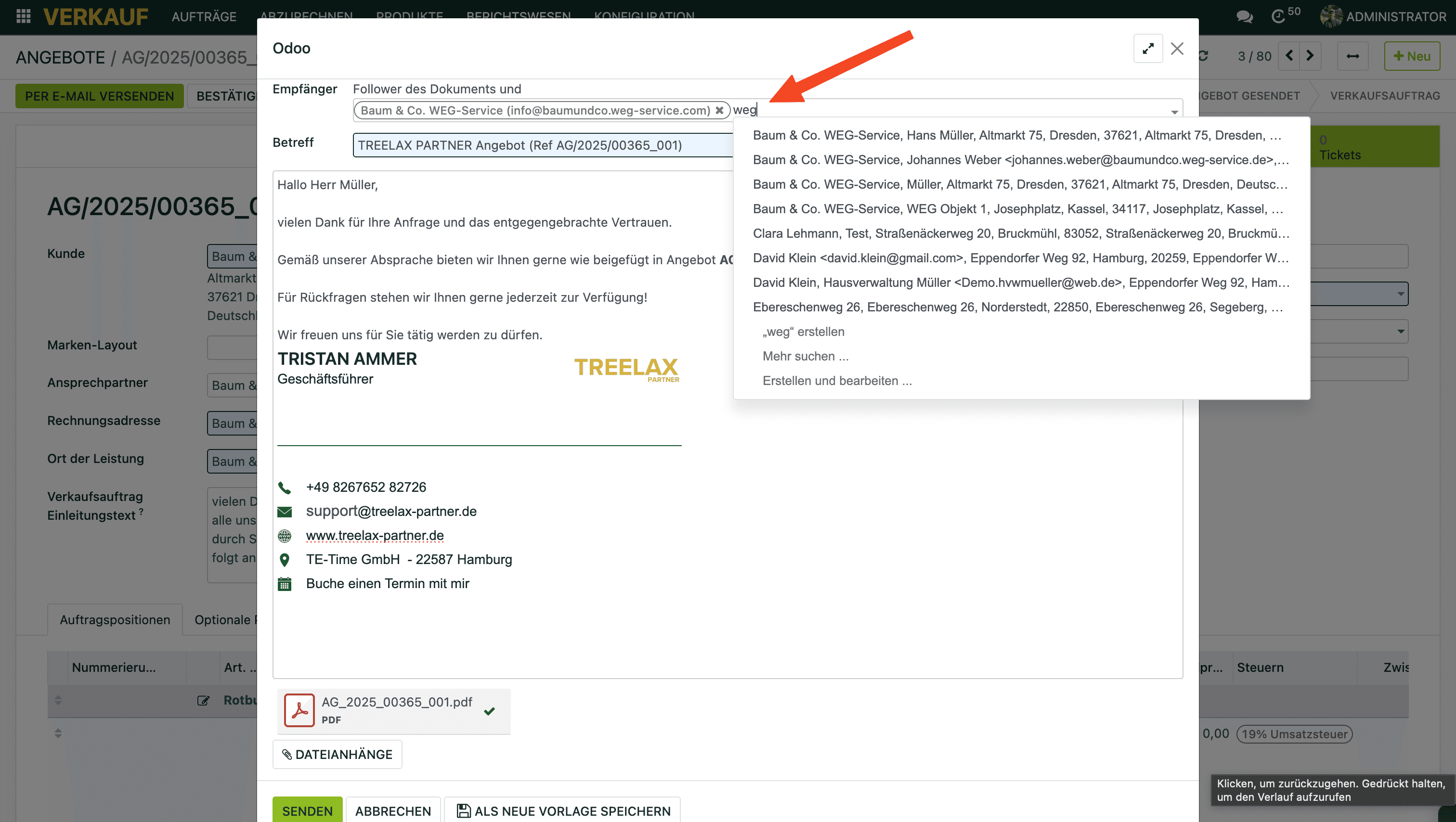 Du verschickst ein fertiges Angebot per E-Mail direkt aus TREELAX Partner – an einen oder mehrere Empfänger.