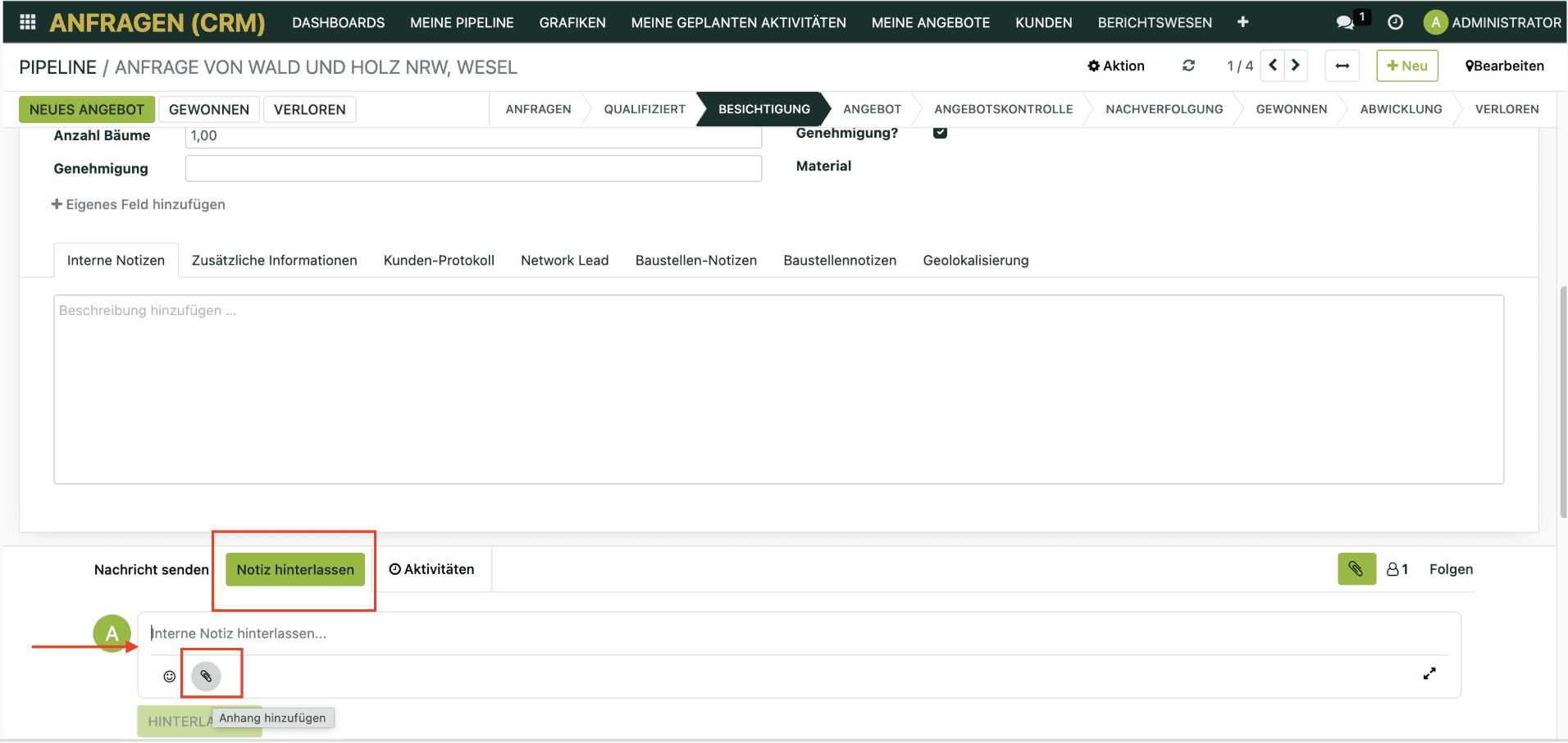 Wenn du auf „Notiz hinterlassen“ klickst, kannst du eine interne Notiz schreiben und deine Anhänge hinzufügen, indem du auf das Büroklammer-Symbol klickst.