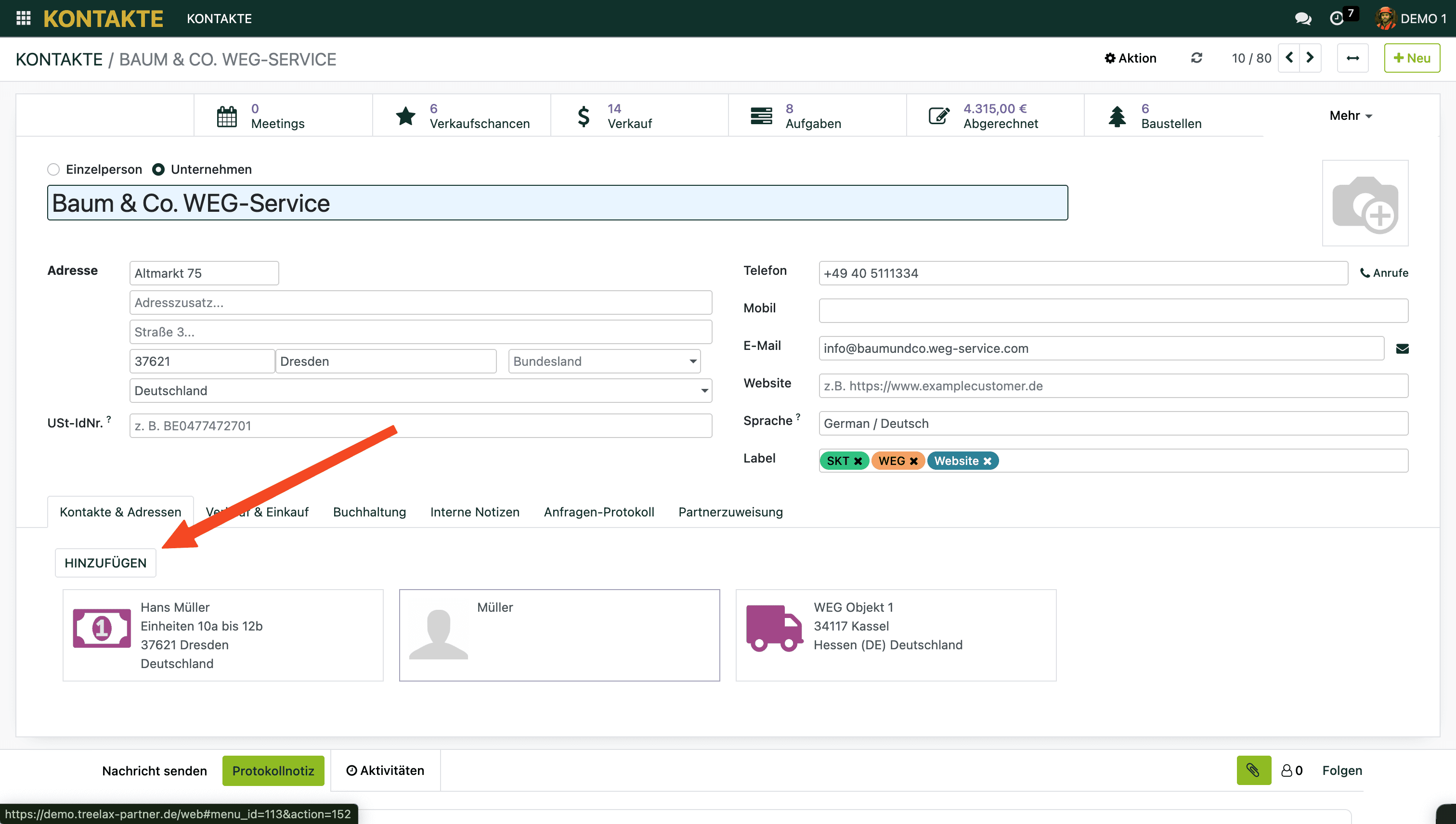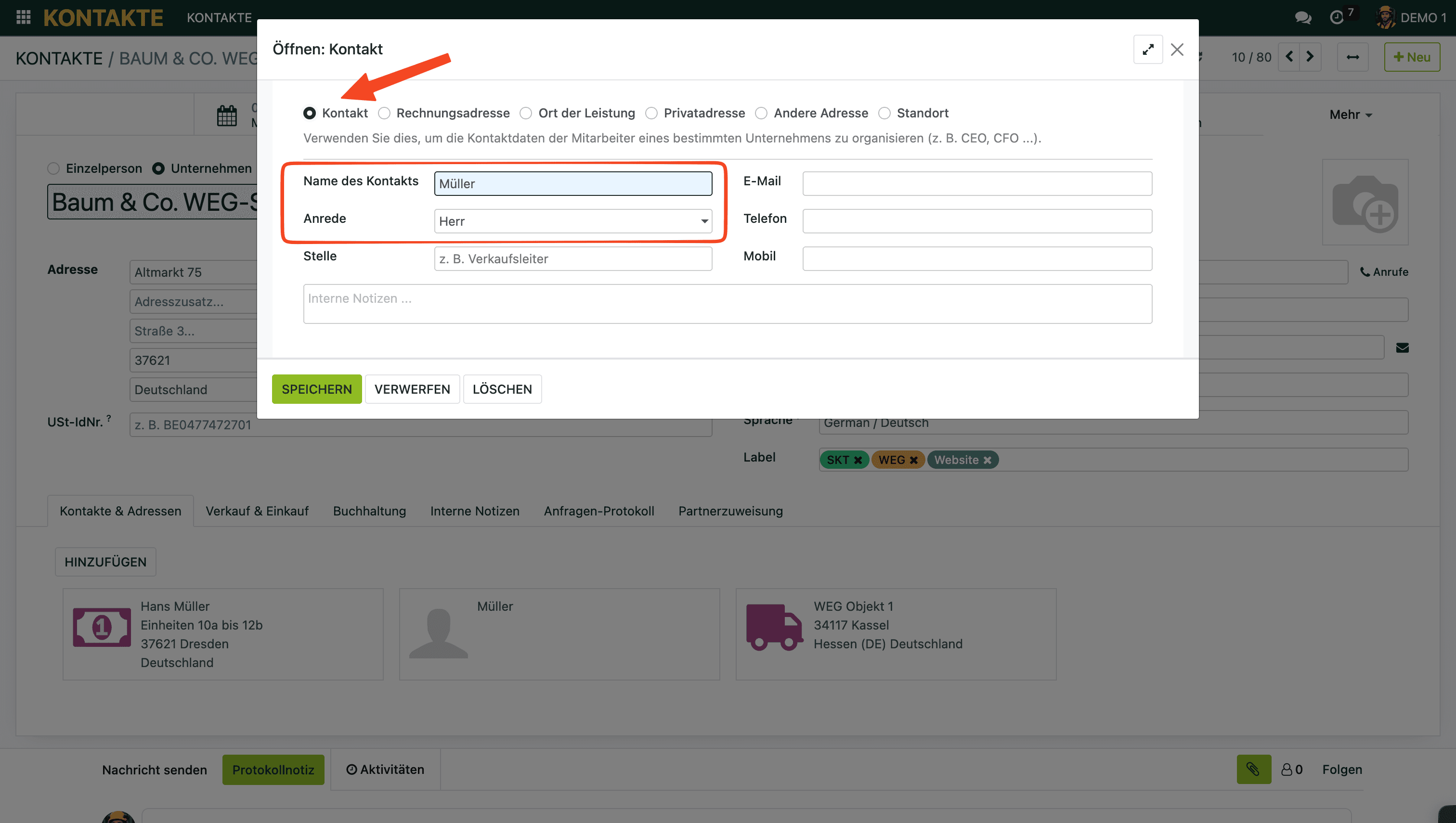 Lege unter dem Hauptkontakt einen Ansprechpartner an (Typ: „Kontakt") – falls noch nicht vorhanden