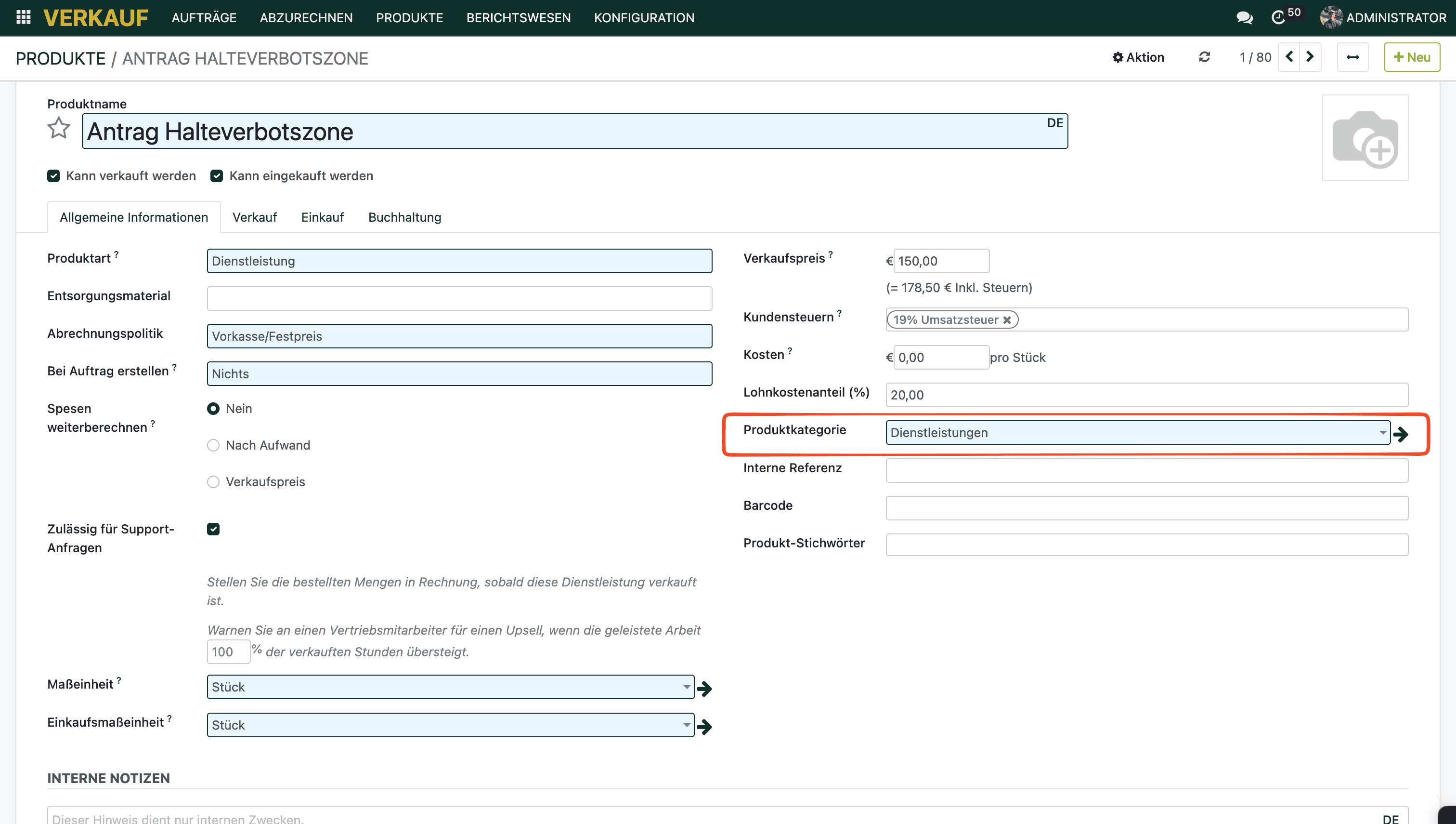 Damit ein Produkt über den Button “Baumpflegedienstleistungen” auswählbar ist, muss es im Produkt selbst die Kategorie „Dienstleistung" haben. Sobald du das bei einem Produkt aktivierst, erscheint es automatisch im Dienstleistungs-Button.