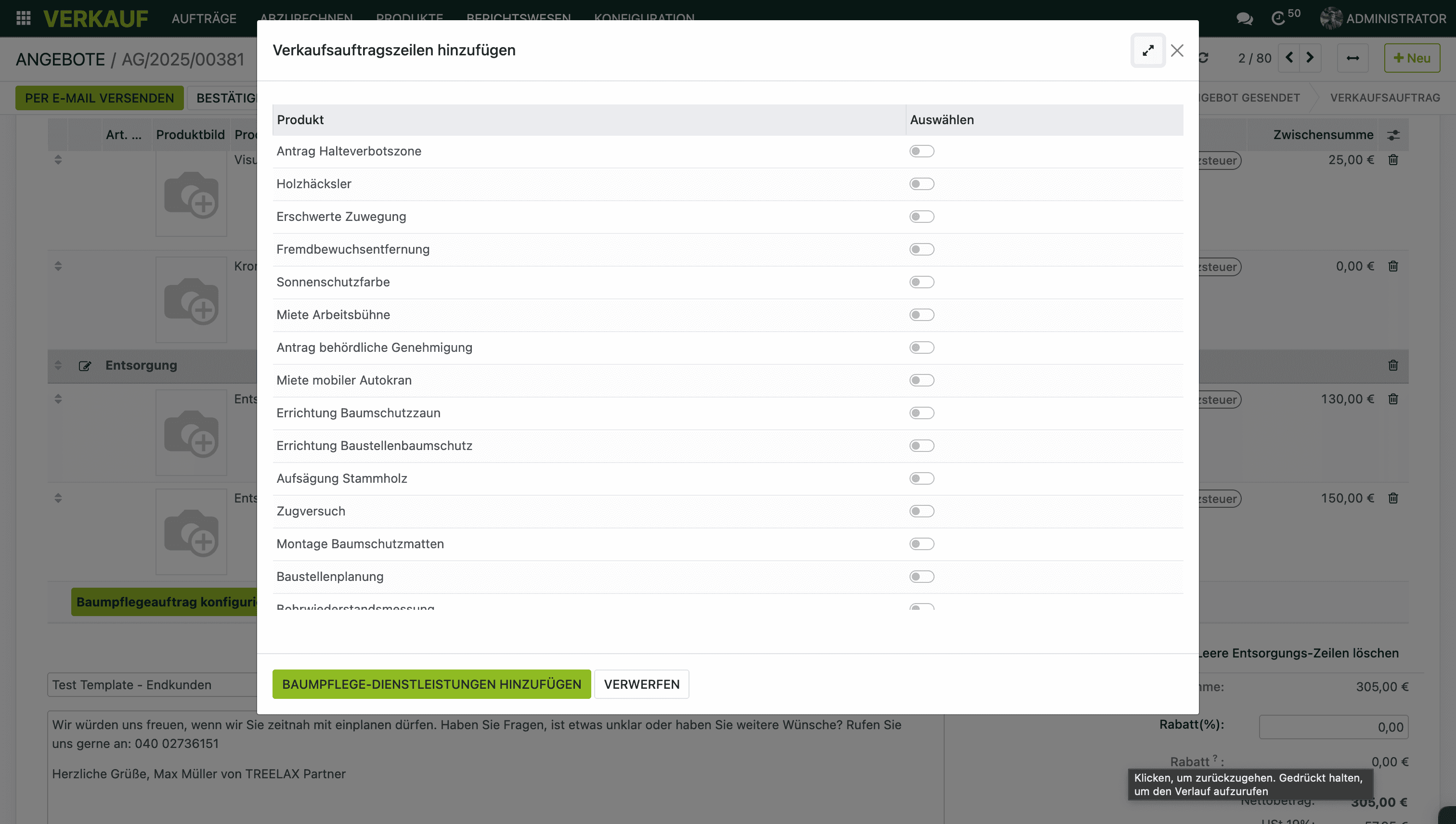 Diese Positionen werden in einem eigenen Abschnitt „Baumpflegedienstleistungen" im Angebot oder in der Rechnung aufgeführt – getrennt von den Baum-Abschnitten, die du über den Konfigurator erstellst.