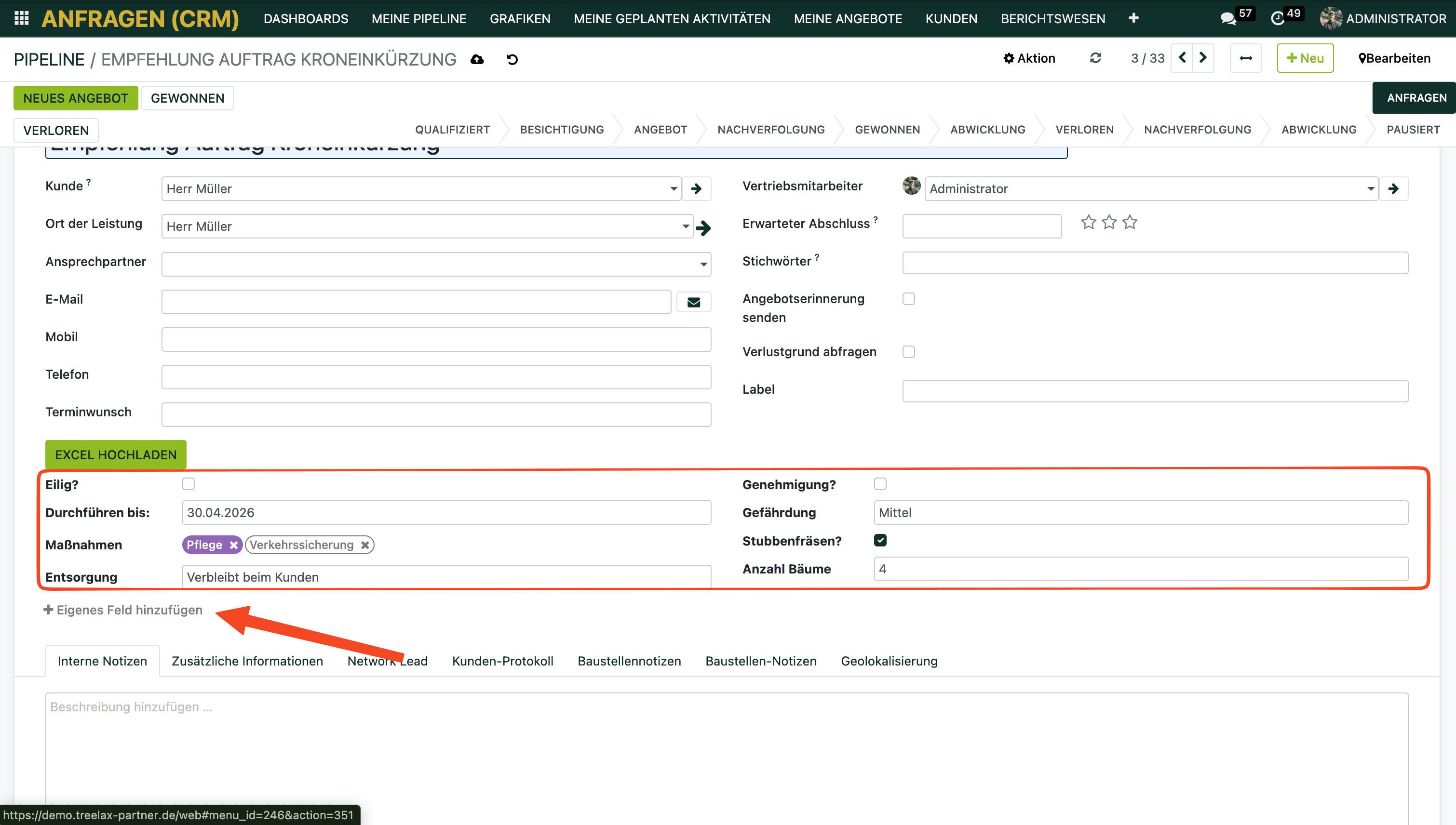 Mit eigenen Feldern kannst du die Anfrage-Kachel so erweitern, dass sie exakt zu deinem Besichtigungsprozess passt. Deine Mitarbeiter müssen nichts mehr in externen Formularen oder auf Papier notieren – alles landet direkt in TREELAX Partner.