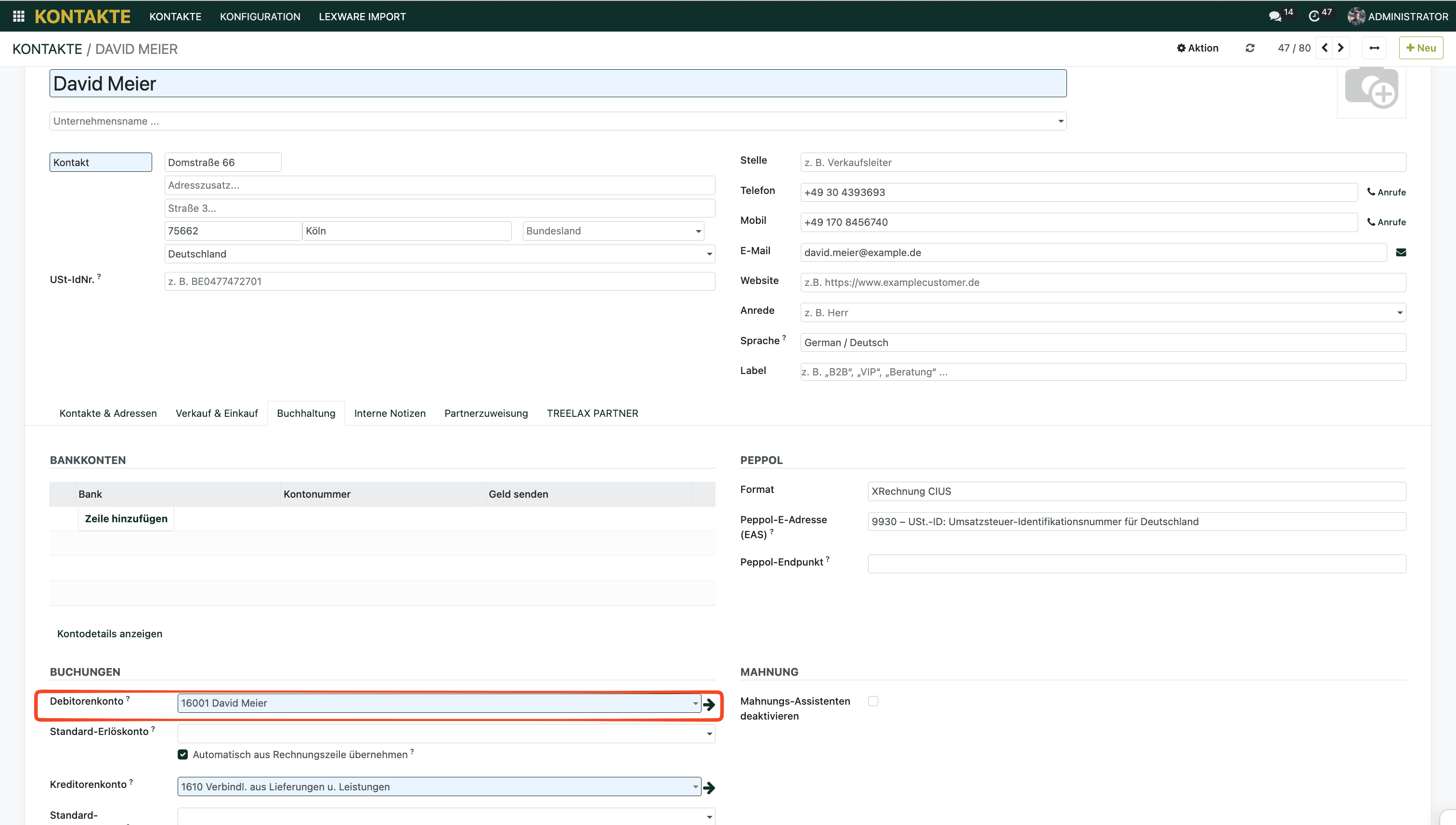 Hinweis: Ohne den Haken “Ist ein Kunde” setzt das System auch keine Debitorennummer fest. Achte hierauf bei der Kontakterstellung. Wenn du den Kontakt über die Anfragen App oder die Angebots- oder Rechnungsfunktion erstellst, denkt TREELAX Partner mit und setzt den Haken für dich.