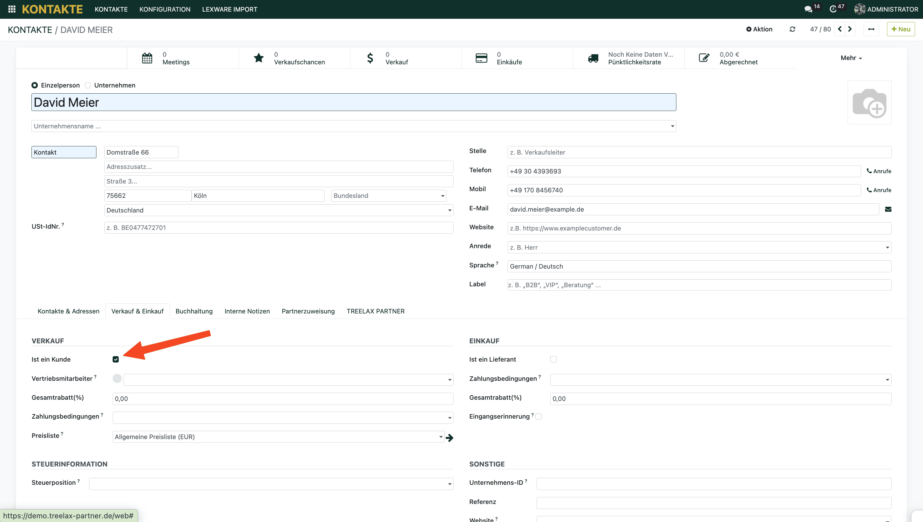 Wechsle auf den Reiter Verkauf & Einkauf. Stelle sicher, dass der Haken “Ist ein Kunde” gesetzt wurde.