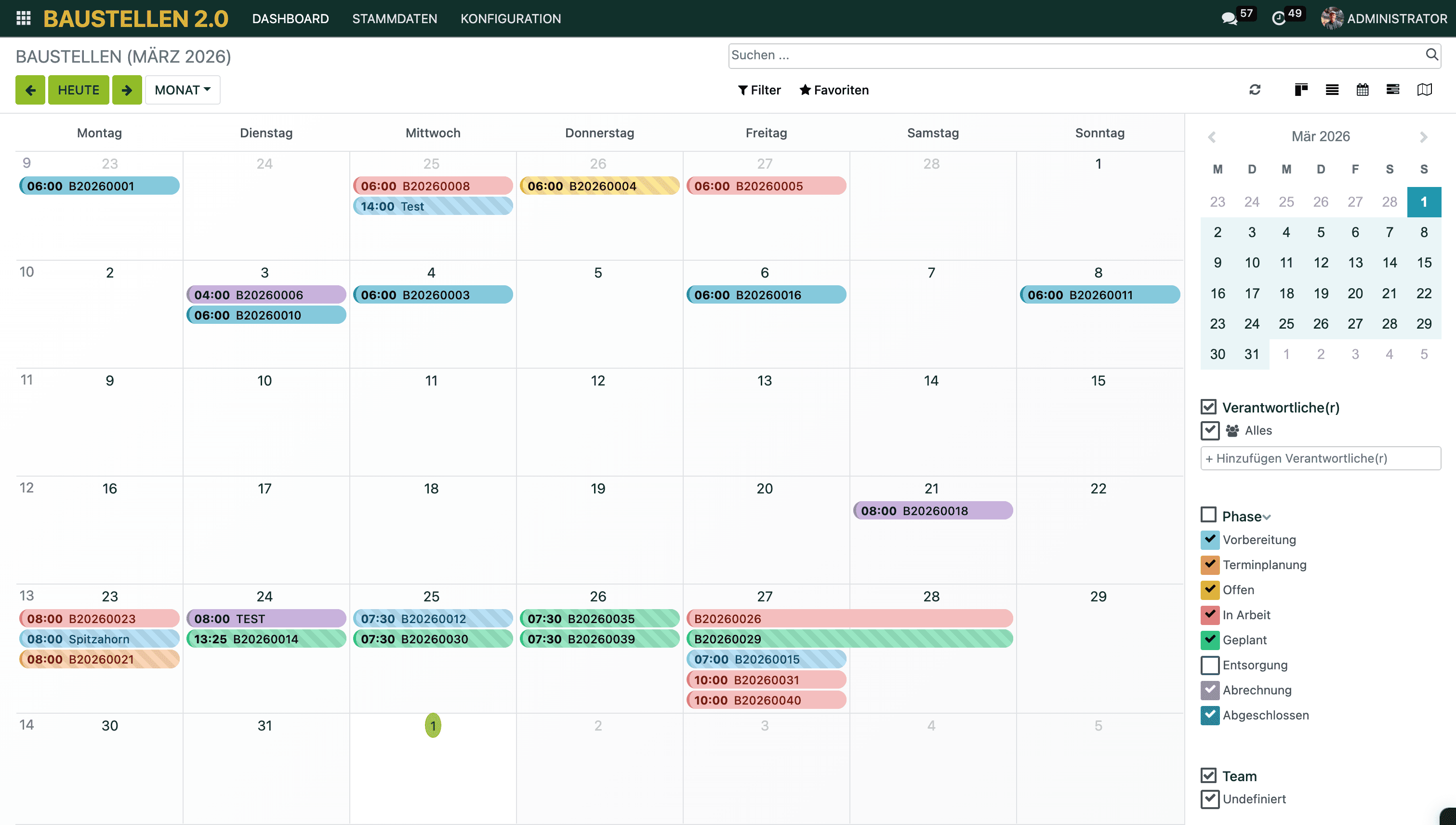 Per Doppelklick auf die jeweilige Baustelle im Kalender öffnet sich die Baustellenakte und alle Details können eingesehen und bearbeitet werden.