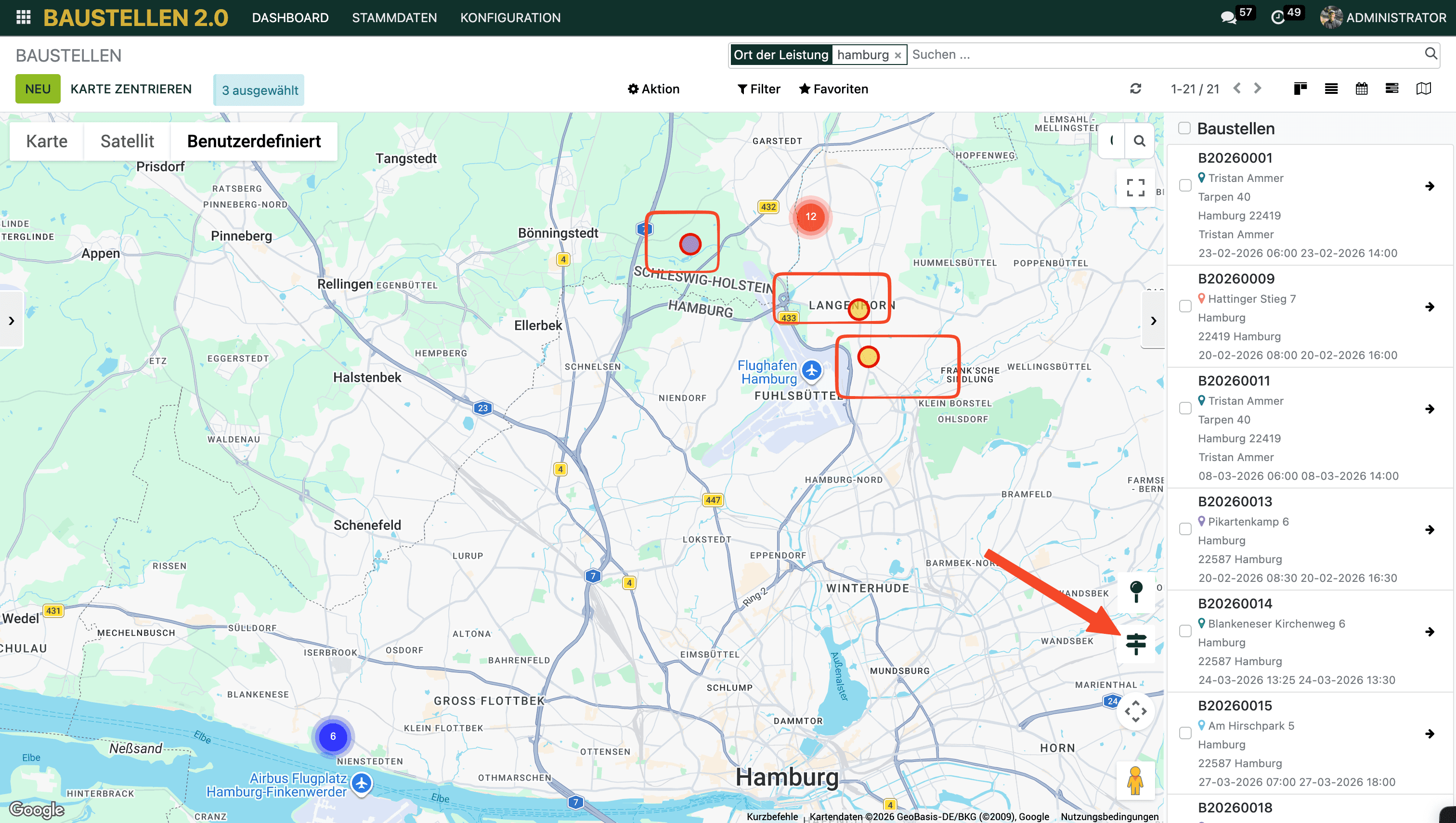 Markiere auf der Kartenansicht über die Umschalt-Taste mehrere Pins – oder wähle auf der rechten Seite per Häkchen die gewünschten Baustellen aus