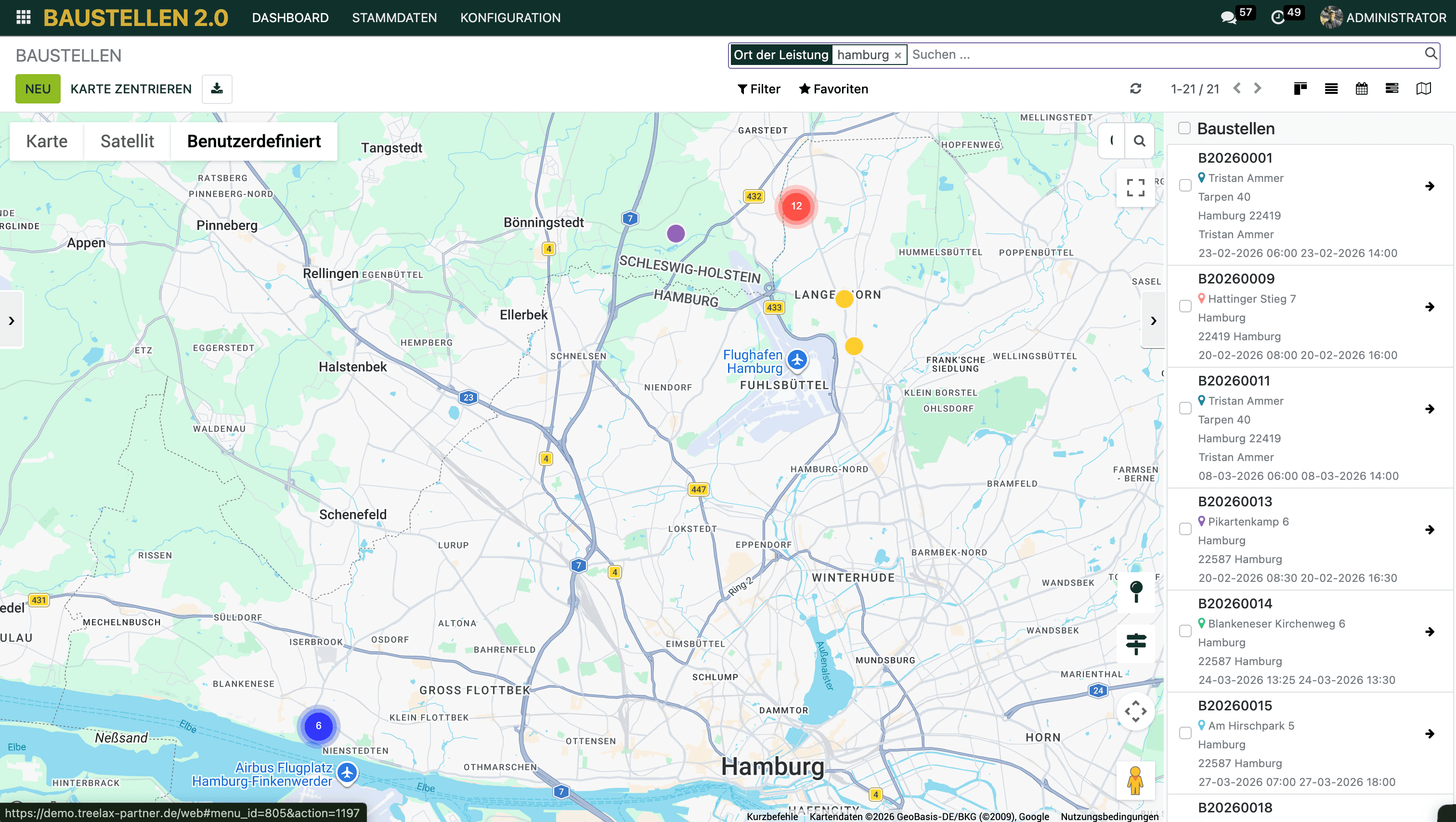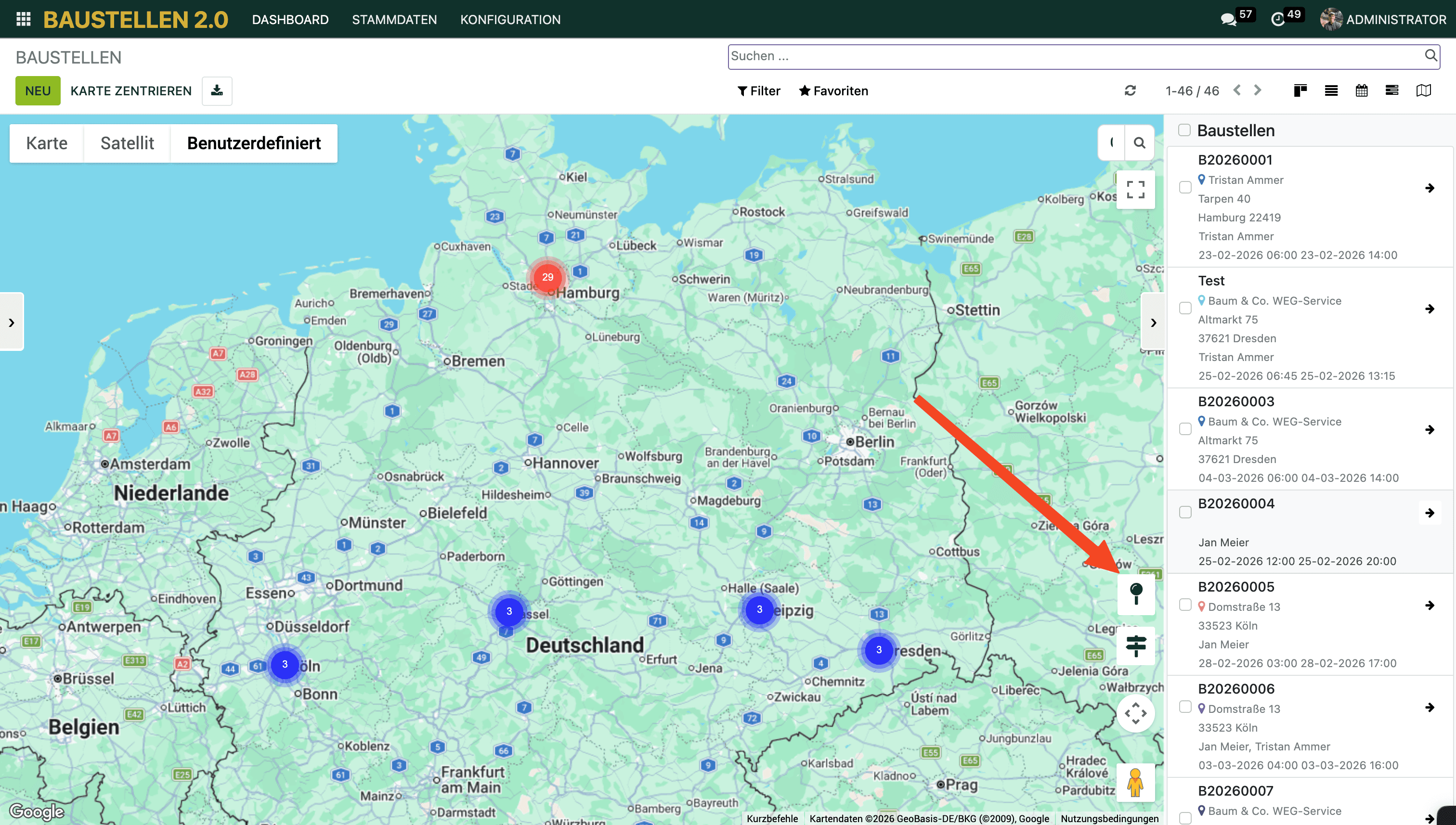 Alle Baustellen mit hinterlegter Adresse erscheinen als farbige Pins auf der Karte.