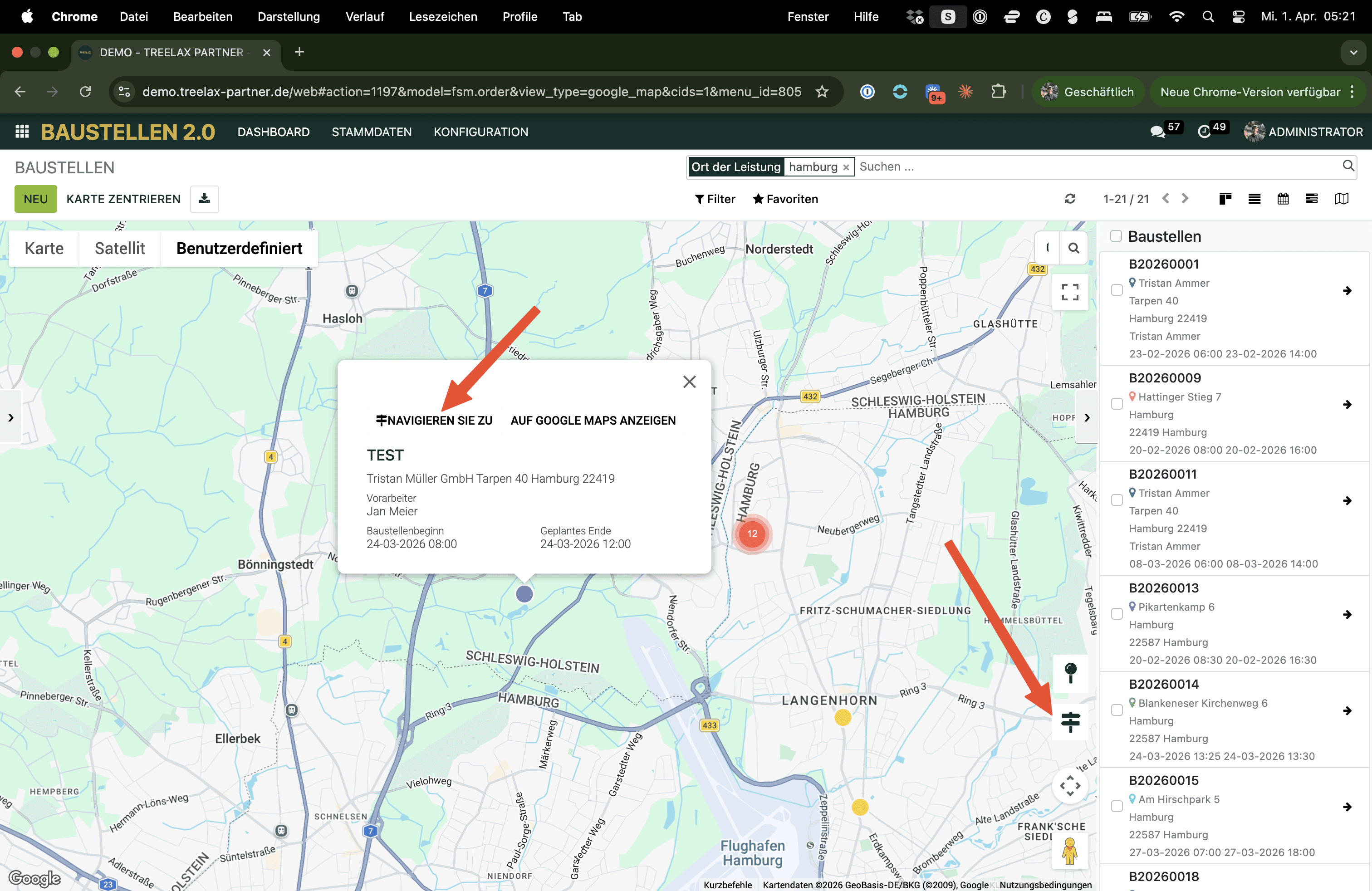 Baustellenadresse auf der Karte präzisieren (GPS-Pin)