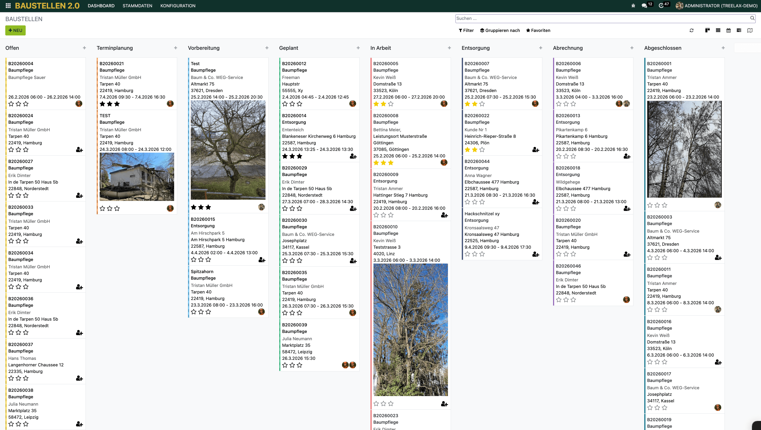 Die Pipeline in Baustellen 2.0 funktioniert ähnlich wie in der App Anfragen (CRM): Jede Baustellenakte ist eine Karte, die du von links nach rechts durch die Phasen schiebst.