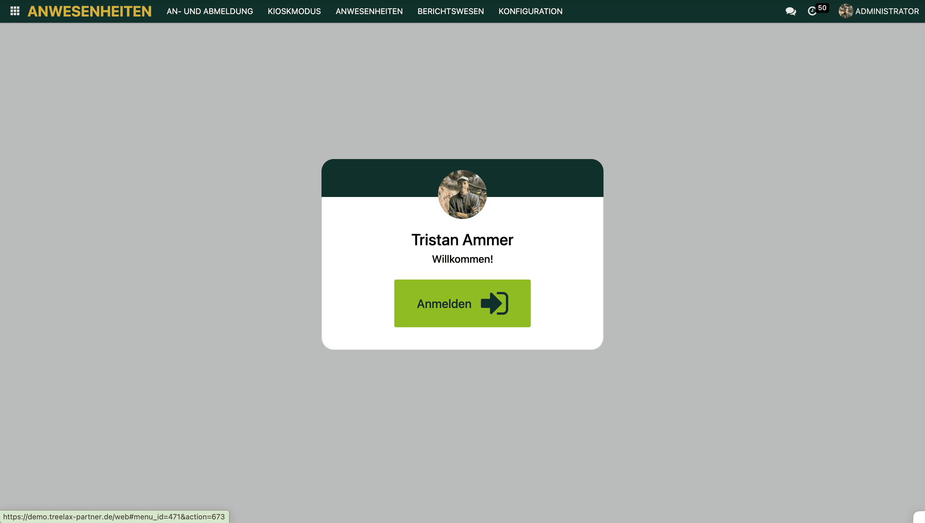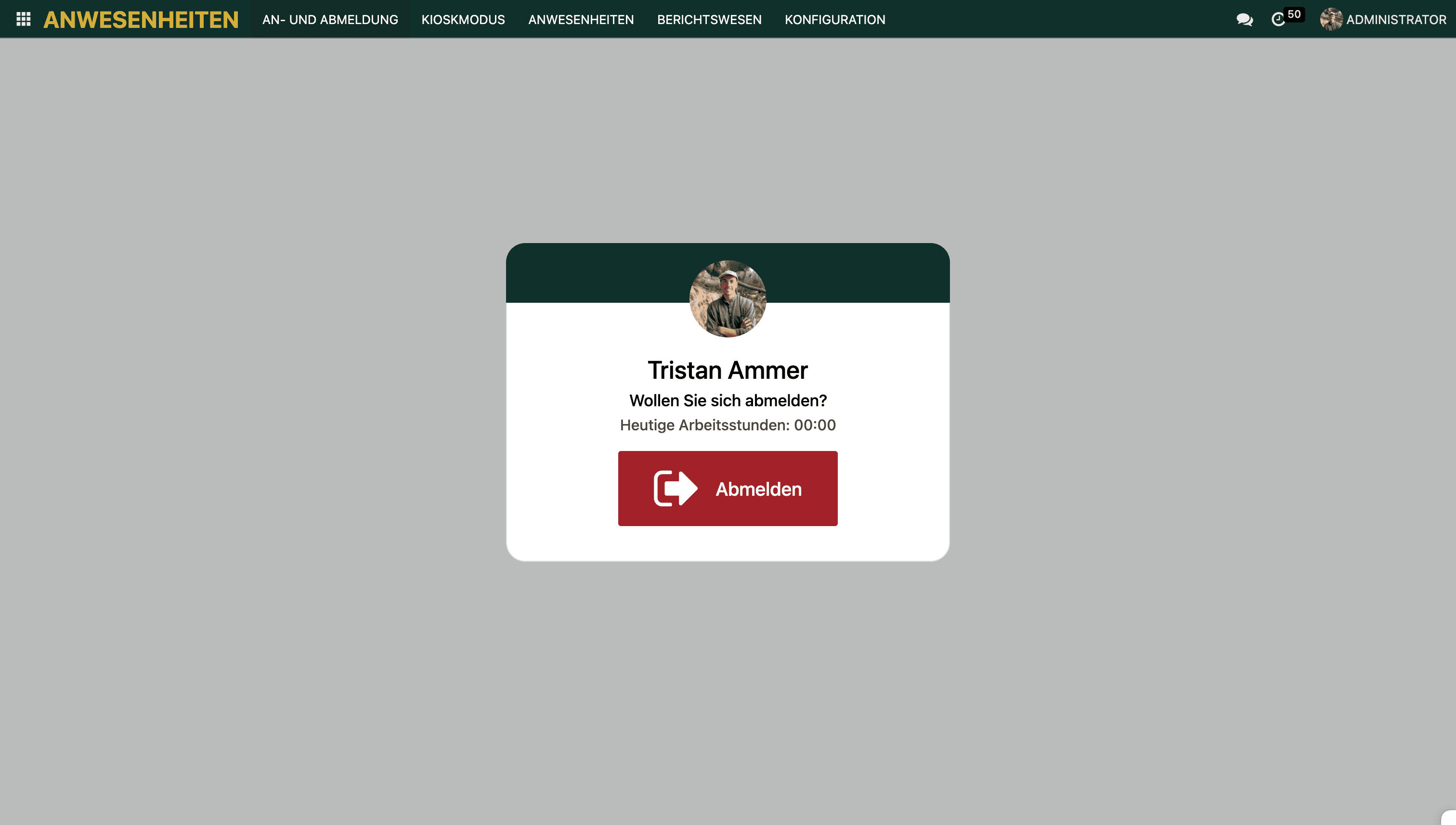 Die Uhrzeit wird automatisch erfasst. Der Mitarbeiter ist jetzt als anwesend markiert.