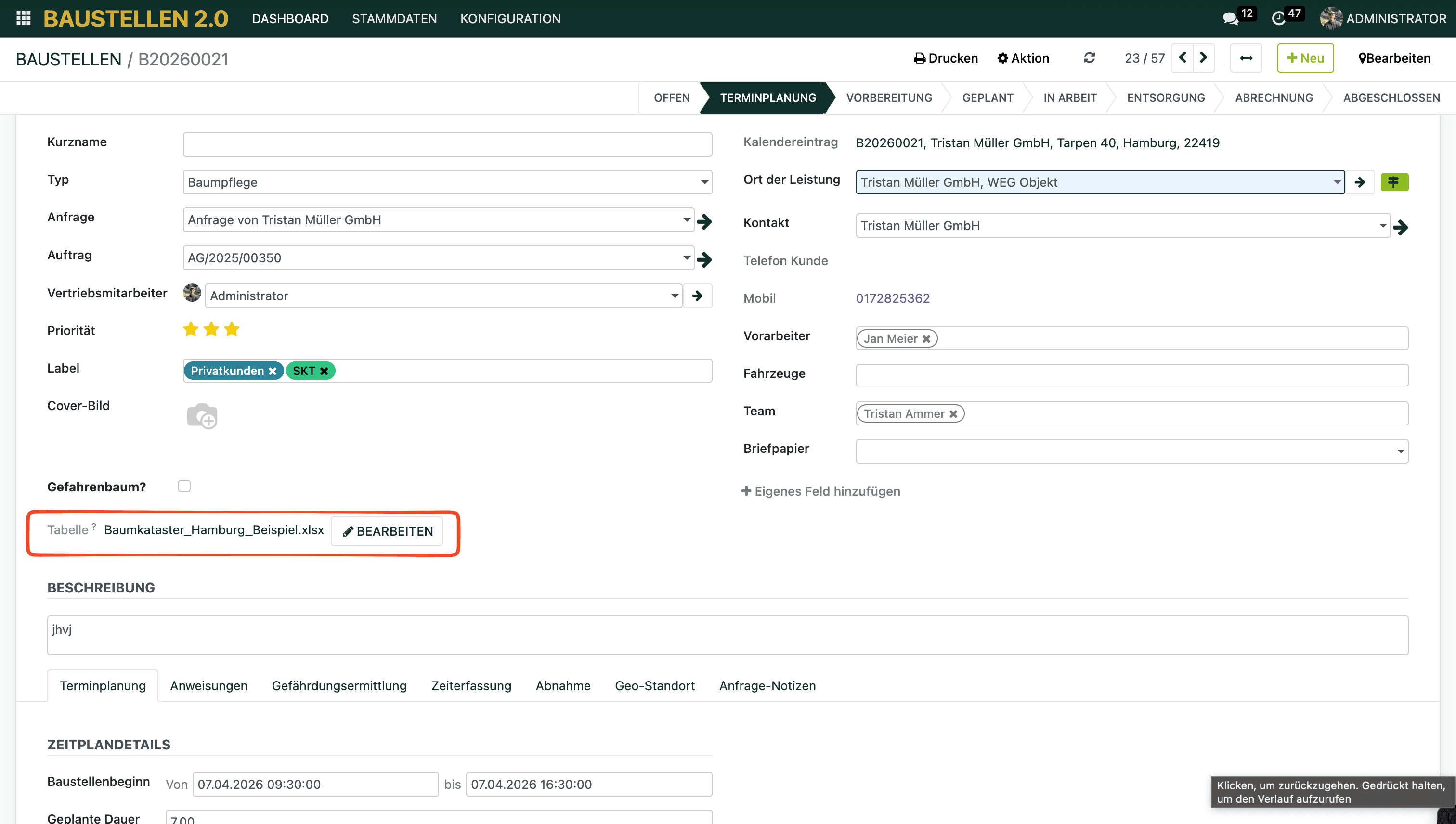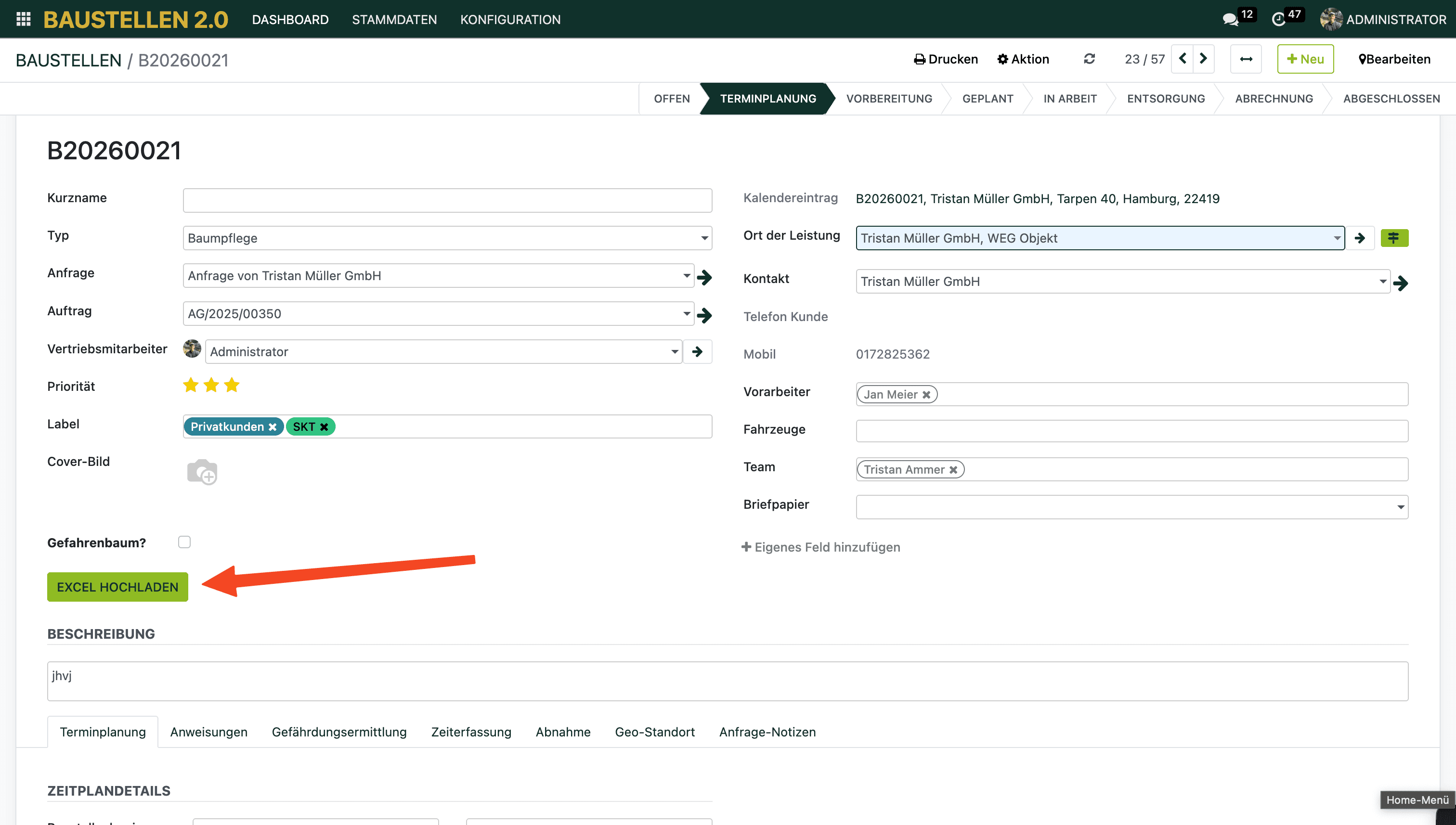 Du lädst eine Excel-Abarbeitungsliste in die Baustellenakte – damit Vorarbeiter auf der Baustelle deine Baum-Listen oder die des Kunden strukturiert durchgehen können und du tagesaktuell den Bearbeitungsstand siehst.