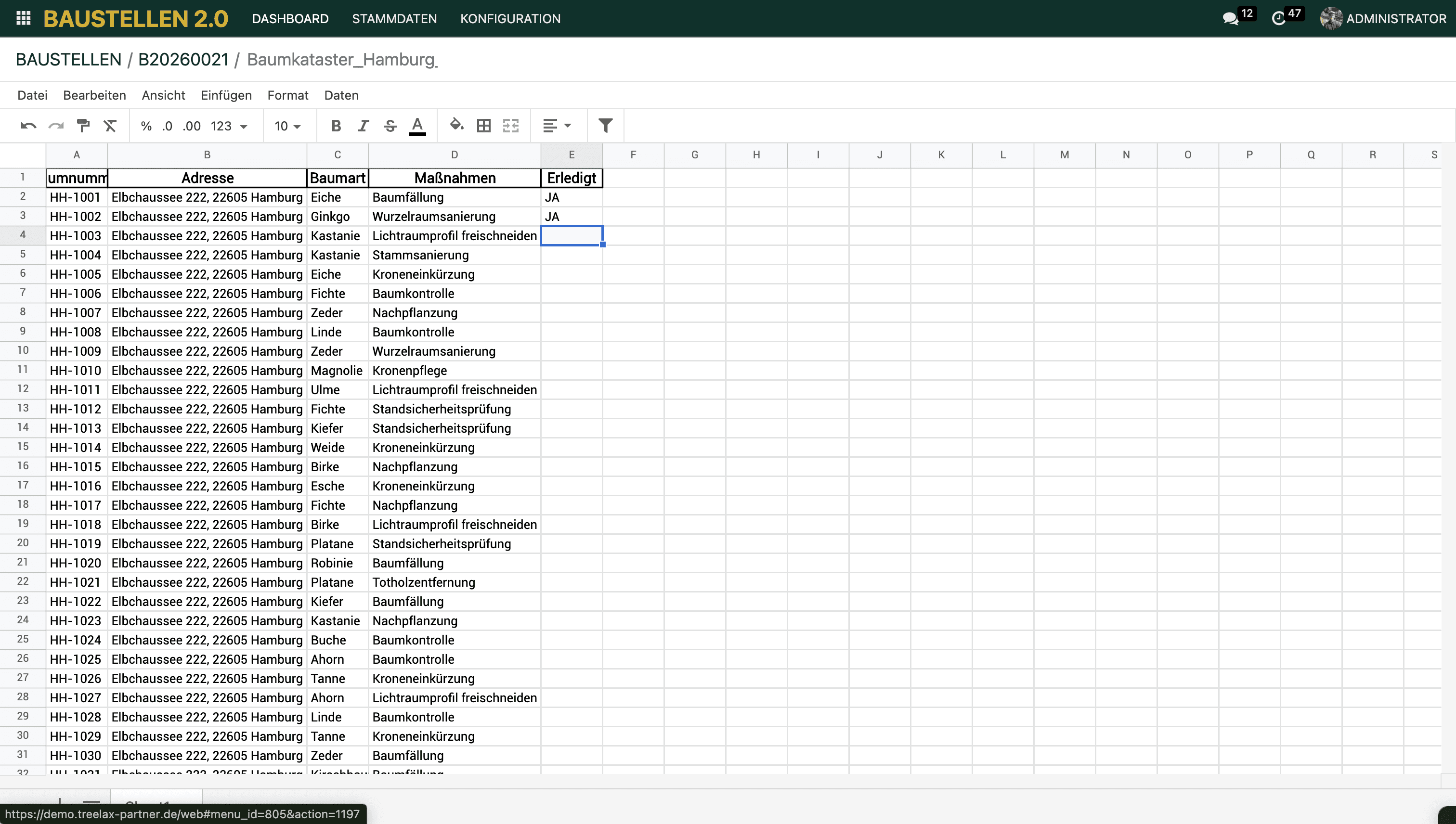 Bei größeren Projekten gibt es oft eine Liste mit dutzenden oder hunderten Bäumen. Anstatt diese im System einzeln als Baustellen anzulegen, lädst du die Excel-Liste direkt in eine zusammenhängende Baustellenakte hoch. Vorarbeiter sehen sie dort auf dem Tablet und können sie Zeile für Zeile direkt im System bearbeiten.