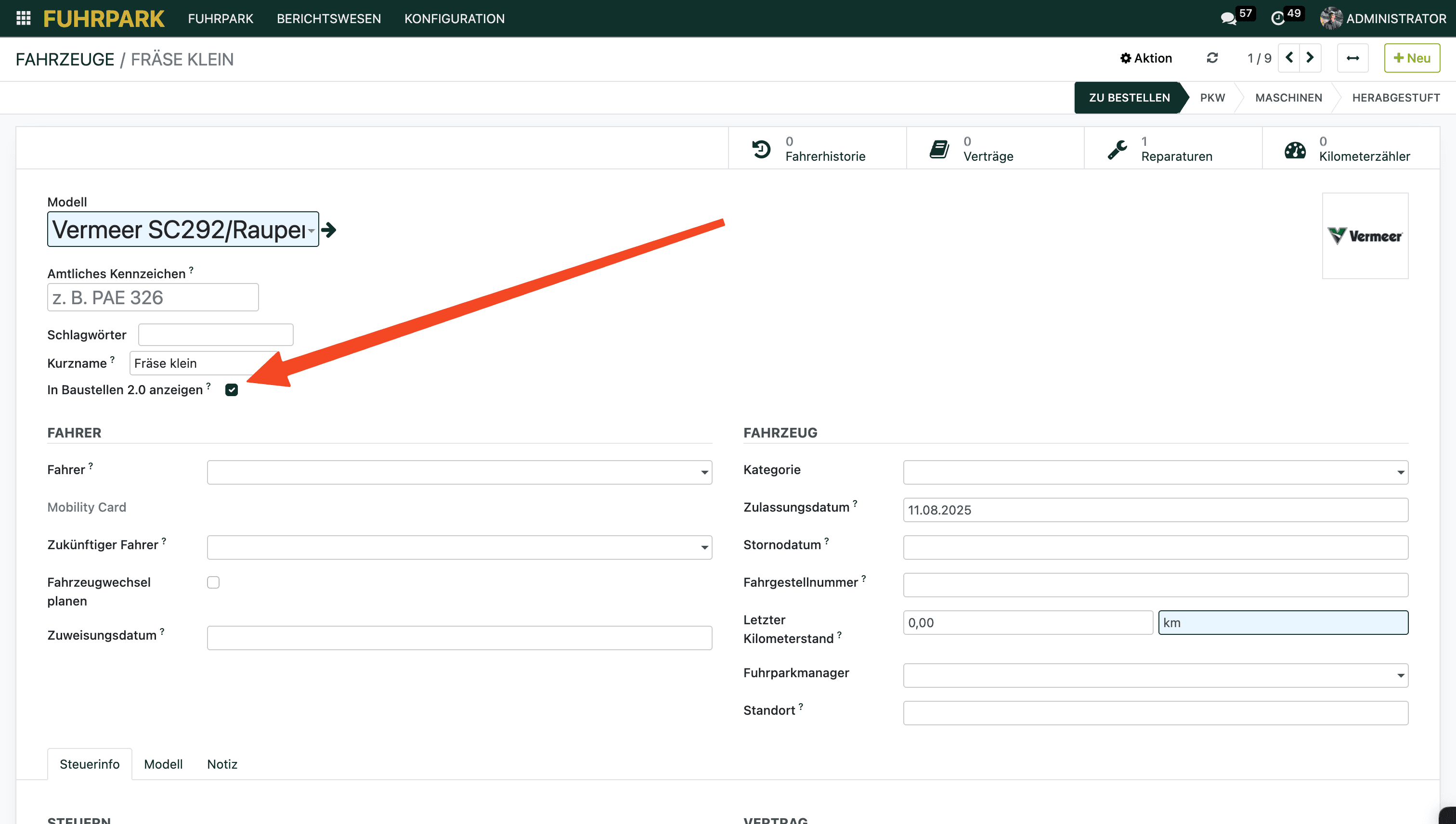 „In Baustellen 2.0 anzeigen" ist deaktiviert. Öffne das Fahrzeug im Fuhrpark und aktiviere den entsprechenden Toggle.