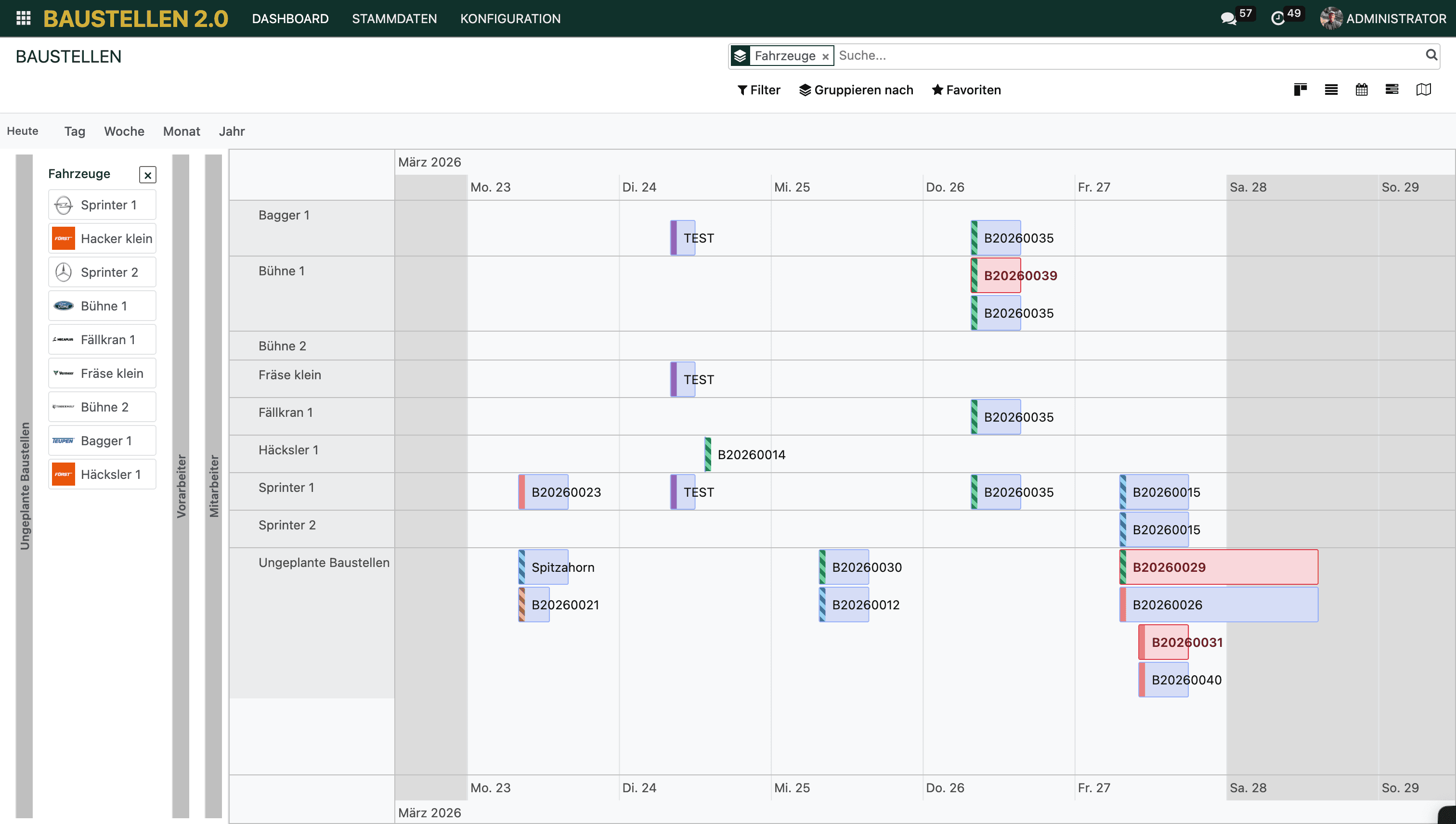 Sobald du ein Fahrzeug auf eine Baustelle geplant hast, erscheint es in der Plantafel. Stelle hierzu die Plantafel über Gruppieren > Fahrzeuge auf die Fahrzeugplanung um. So siehst du auf einen Blick, welche Fahrzeuge wann und wo eingesetzt sind, und vermeidest Doppelbelegungen (rot markiert).