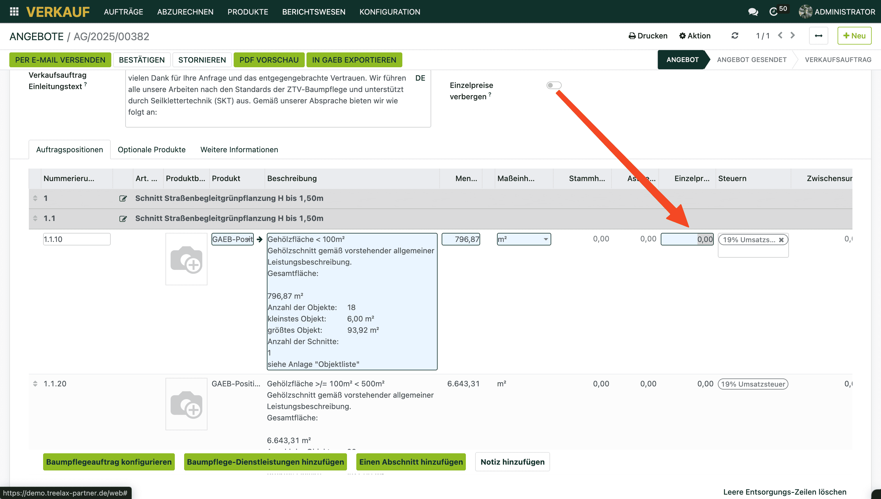 Nach dem Import siehst du alle Positionen in der Angebotsmaske. Trage jetzt deine Einheitspreise ein. Die Gesamtbeträge werden automatisch berechnet.