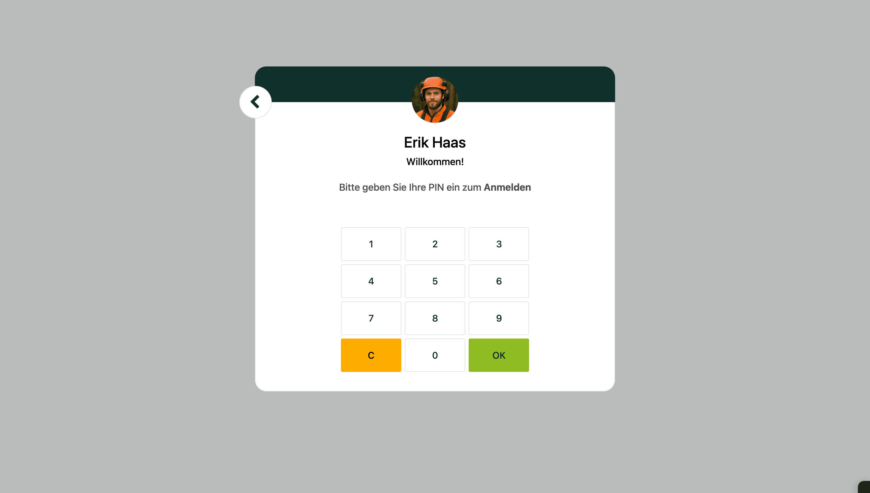 Jeder Mitarbeiter kann sich nun auswählen und mit seiner PIN an- und abmelden: