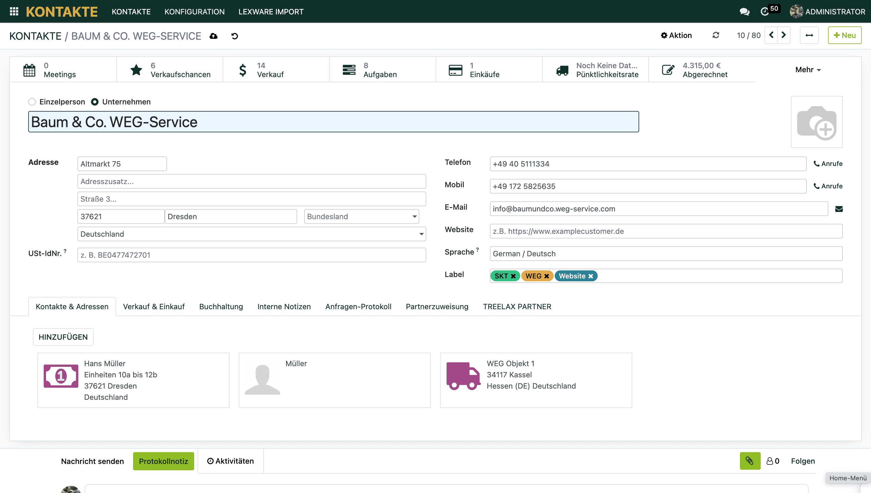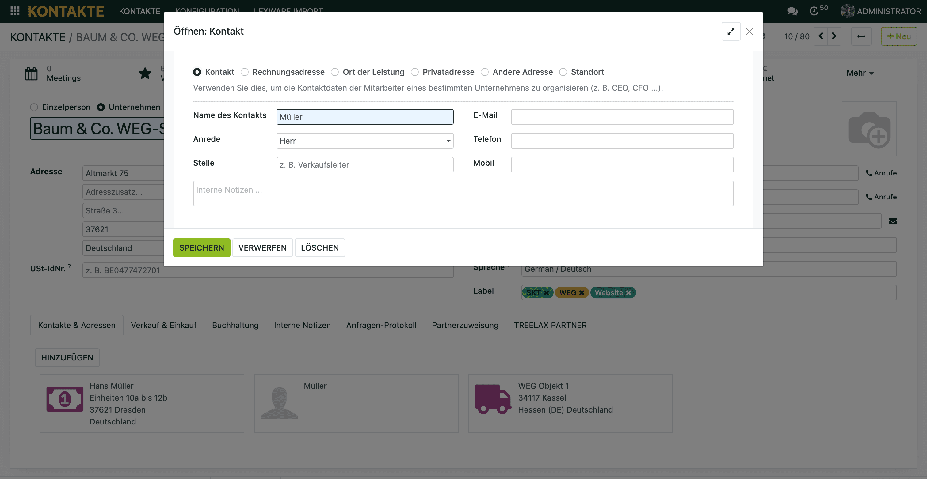 Du legst Kontakte in TREELAX Partner richtig an – mit der richtigen Trennung zwischen Hauptkontakt, Ansprechpartner, Rechnungsadresse und Ort der Leistung.