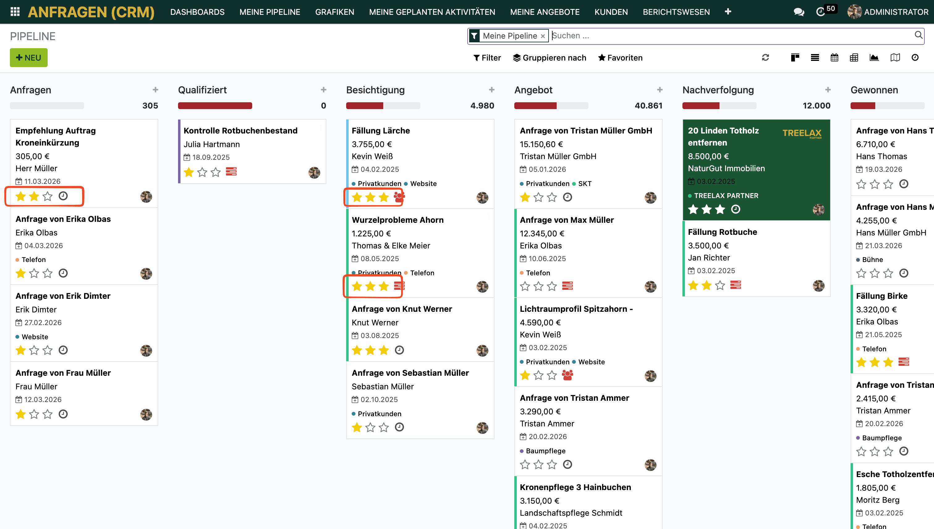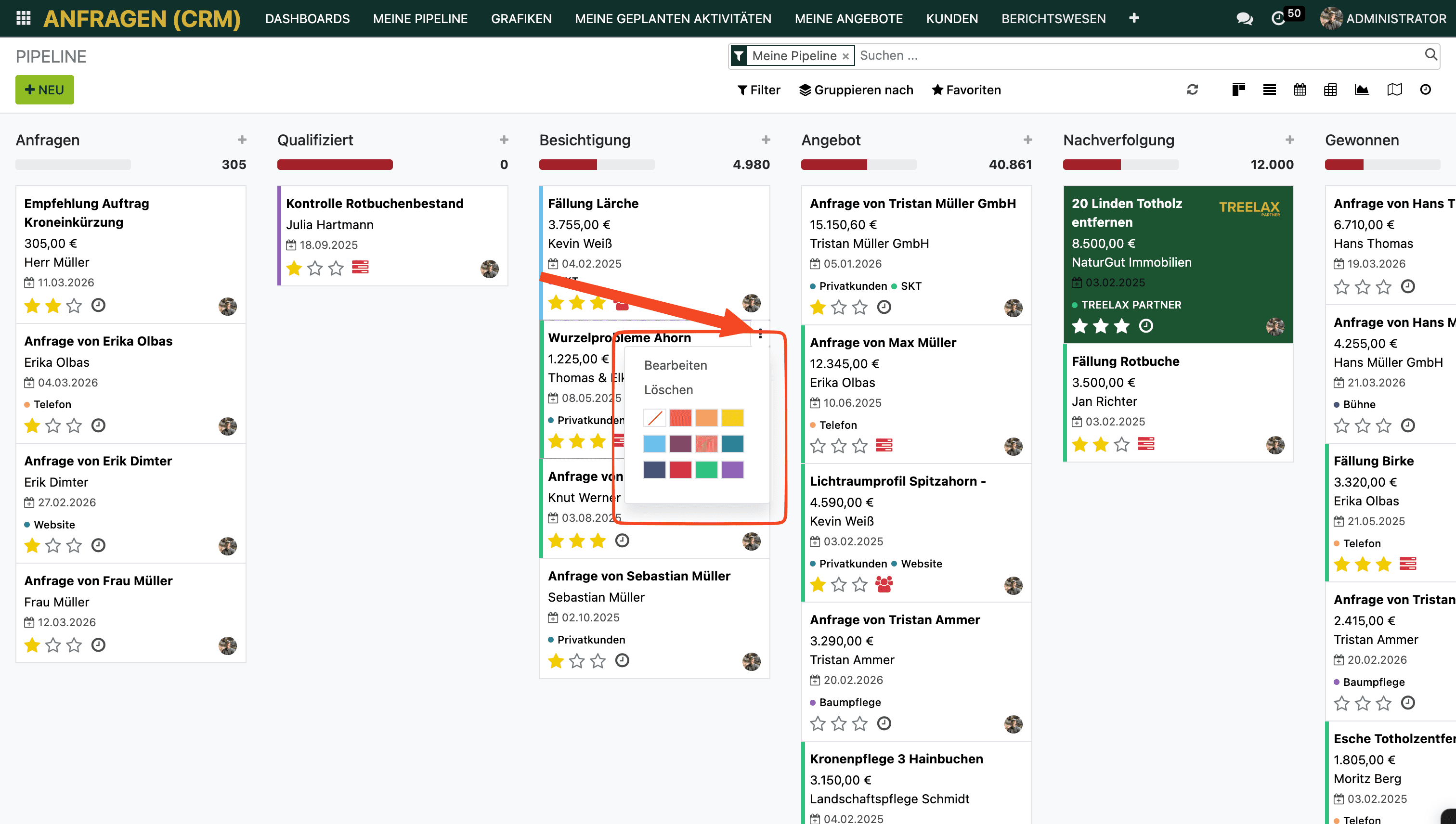 Du vergibst Prioritäten, Labels, Stichwörter und Farben für deine Anfrage-Kacheln, um deine Pipeline übersichtlich zu halten und schnell zu sehen, welche Anfragen dringend sind.