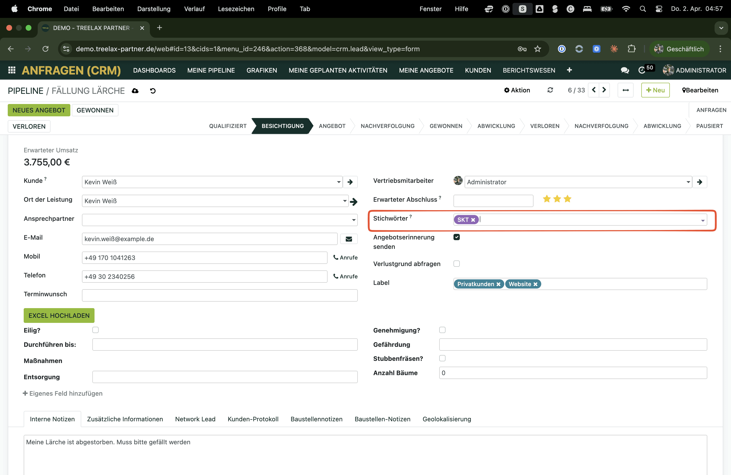 Auftrags- oder baustellenbezogene Begriffe wie „SKT" oder „Gefahrenbaum" → als Stichwort vergeben