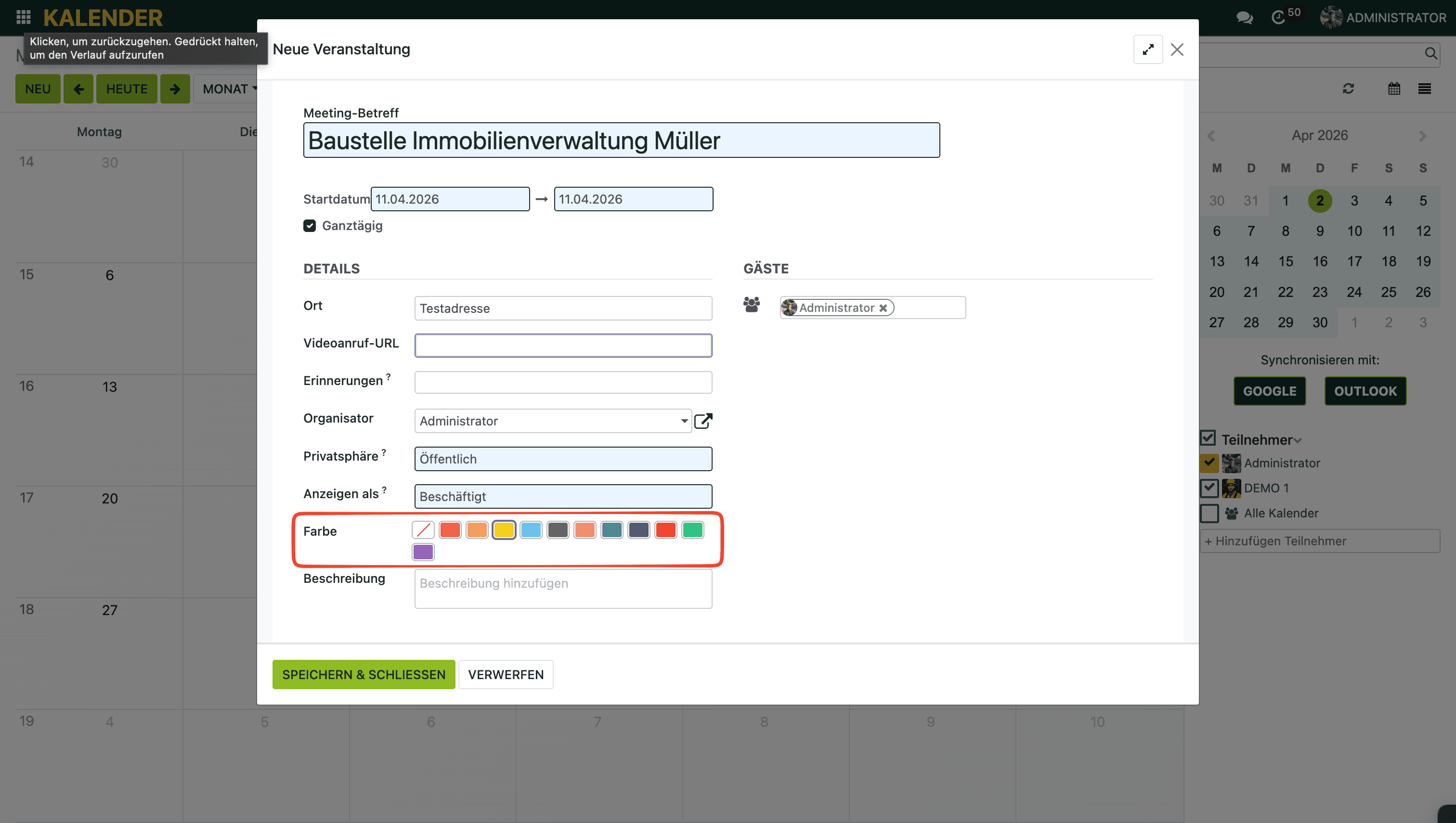 Die Farbkennzeichnung ist direkt in der Erstellungsmaske des Termins verfügbar