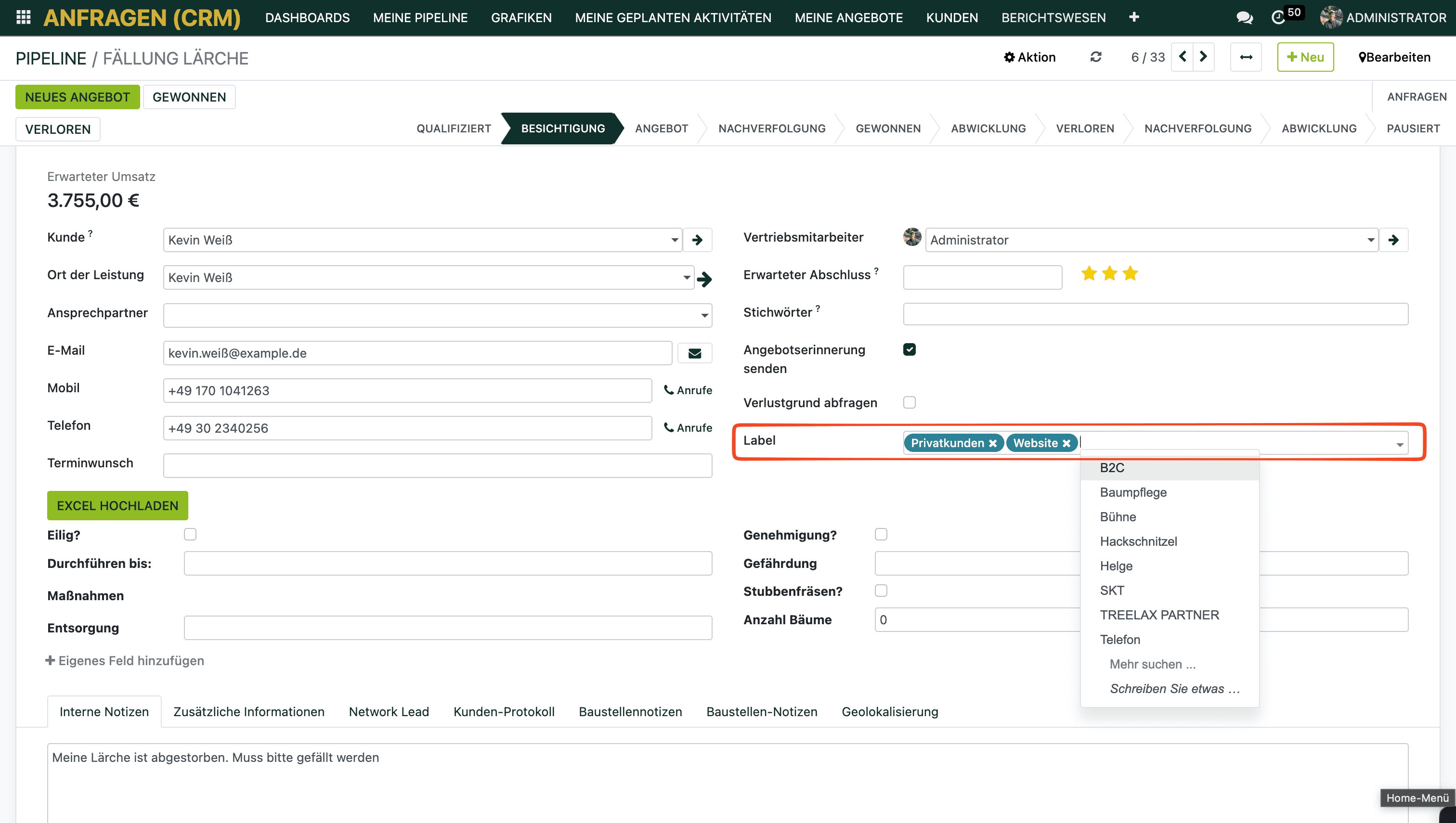 Labels sind farbige Schlagworte, die du frei vergeben kannst – z.B. „Baumpflege", „Fällung", „Gutachten", „Stammkunde", „Großprojekt".