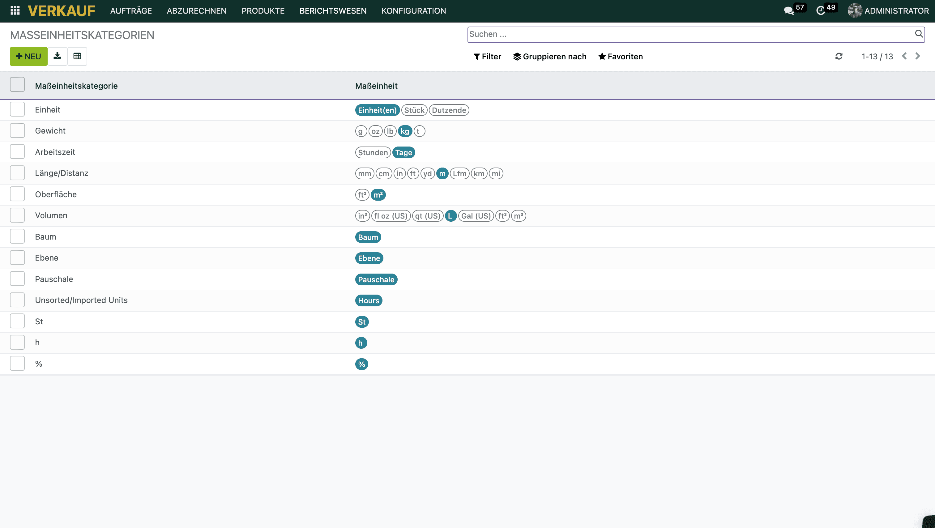 In TREELAX Partner sind Maßeinheiten in Kategorien eingeteilt – z.B.:
