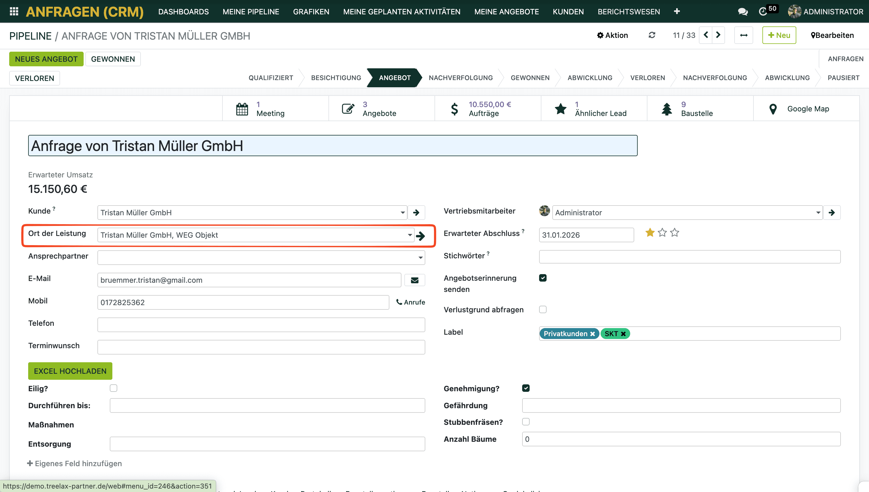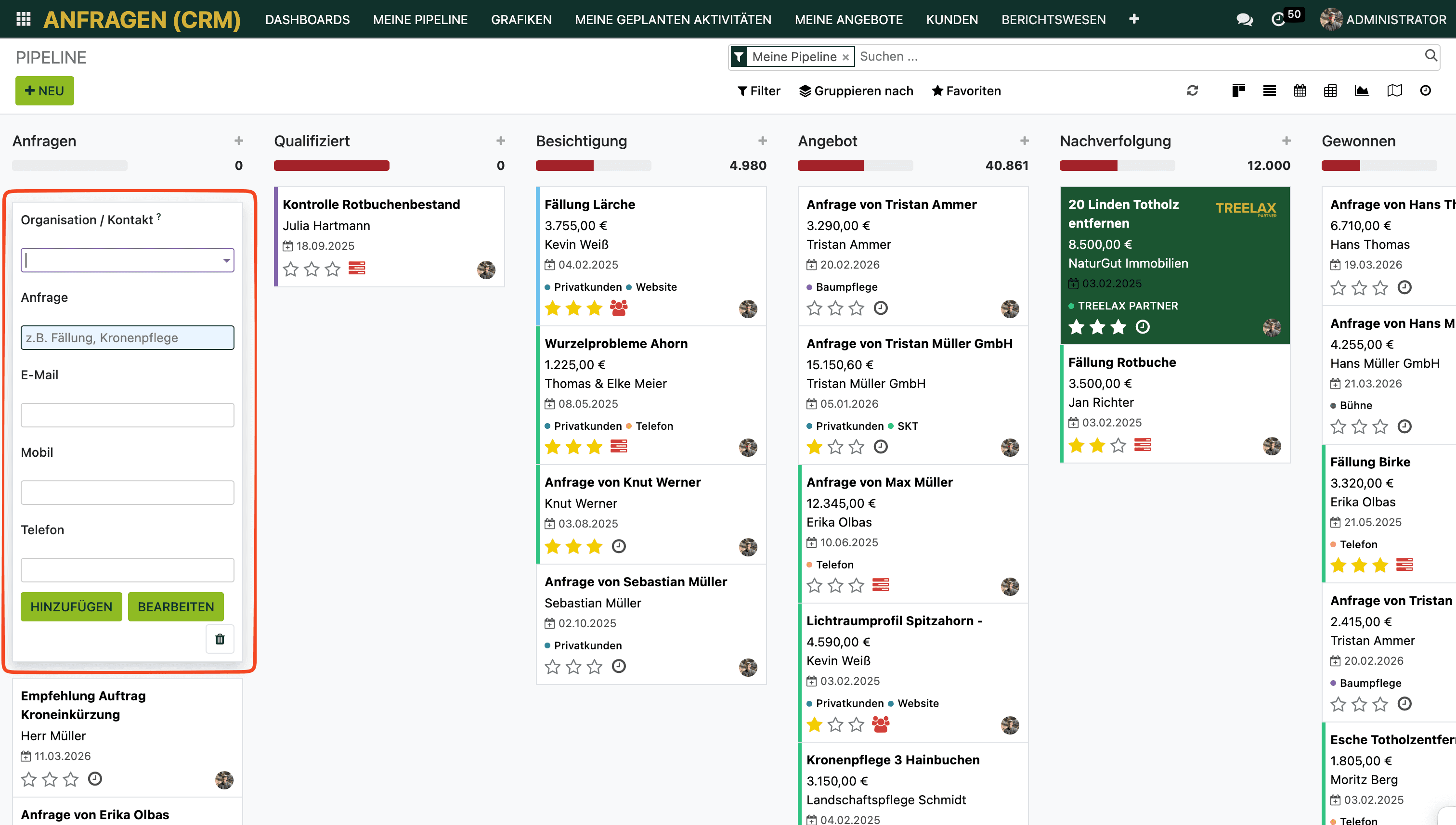 Anfragen, die über dein Website-Formular oder per E-Mail-Weiterleitung reinkommen, landen automatisch im CRM. Aber viele Anfragen entstehen anders: per Telefon, über Empfehlung, per WhatsApp oder beim Gespräch auf der Straße. Die legst du händisch an – mit wenigen Klicks in unter einer Minute.