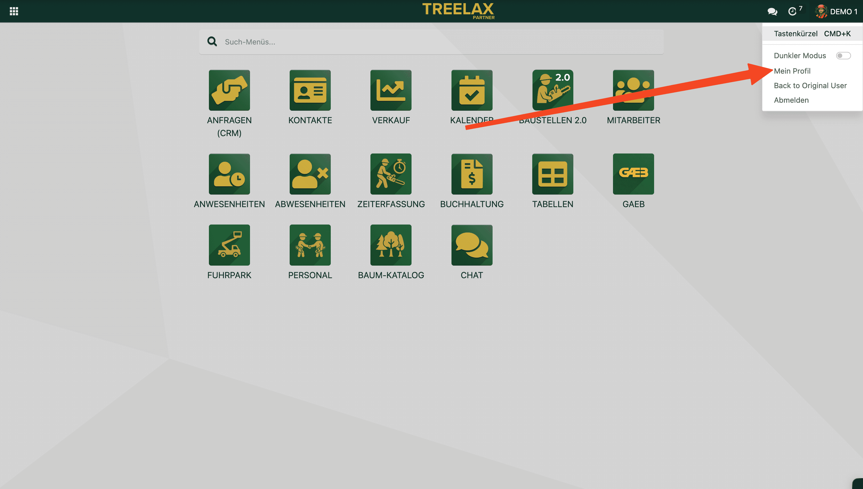 Klicke oben rechts auf deinen Benutzernamen. Es öffnet sich ein Menü – wähle dort „Mein Profil".