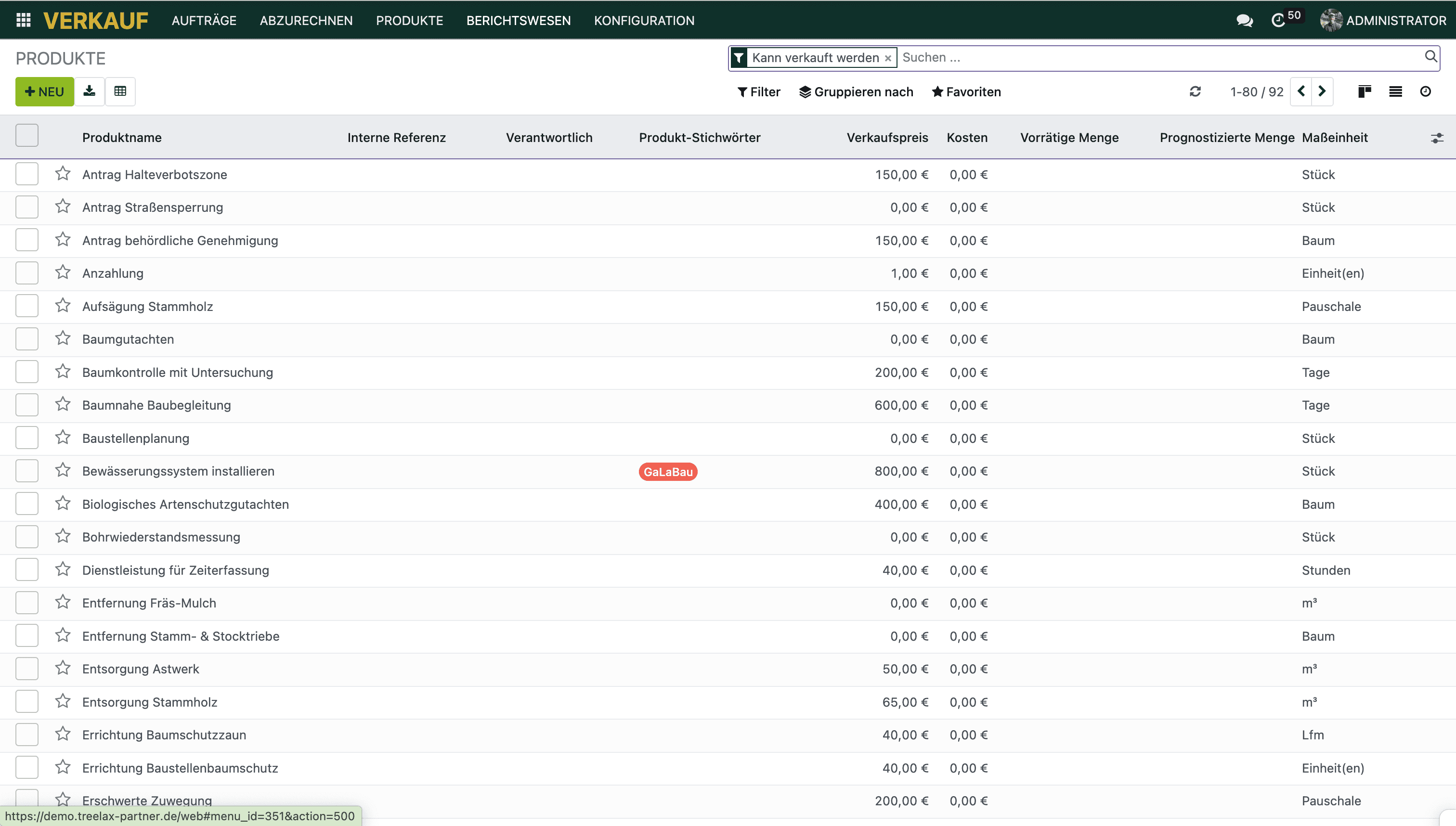 TREELAX Partner liefert bereits einen Standard-Produktkatalog mit gängigen Baumpflege-Produkten entlang der ZTV-Baumpflege. Diesen kannst du nutzen, musst es aber nicht. Alles, was du nicht brauchst, kannst du über Aktion → Archivieren ins Archiv schieben.