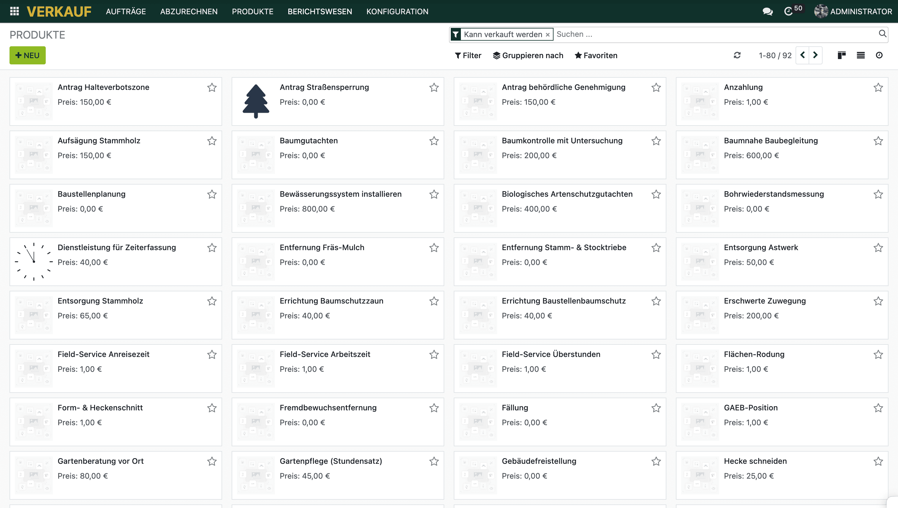 Die einzige Kategorie mit echter Systemfunktion ist „Dienstleistung": Alle Produkte, die du in diese Kategorie einordnest, erscheinen im Angebots- und Rechnungskonfigurator bei Klick auf den Button „Baumpflegedienstleistungen hinzufügen". Diesen Button nutzt du für auftragsbezogene Produkte wie die Häckselpauschale oder den Antrag für eine Halteverbotszone.