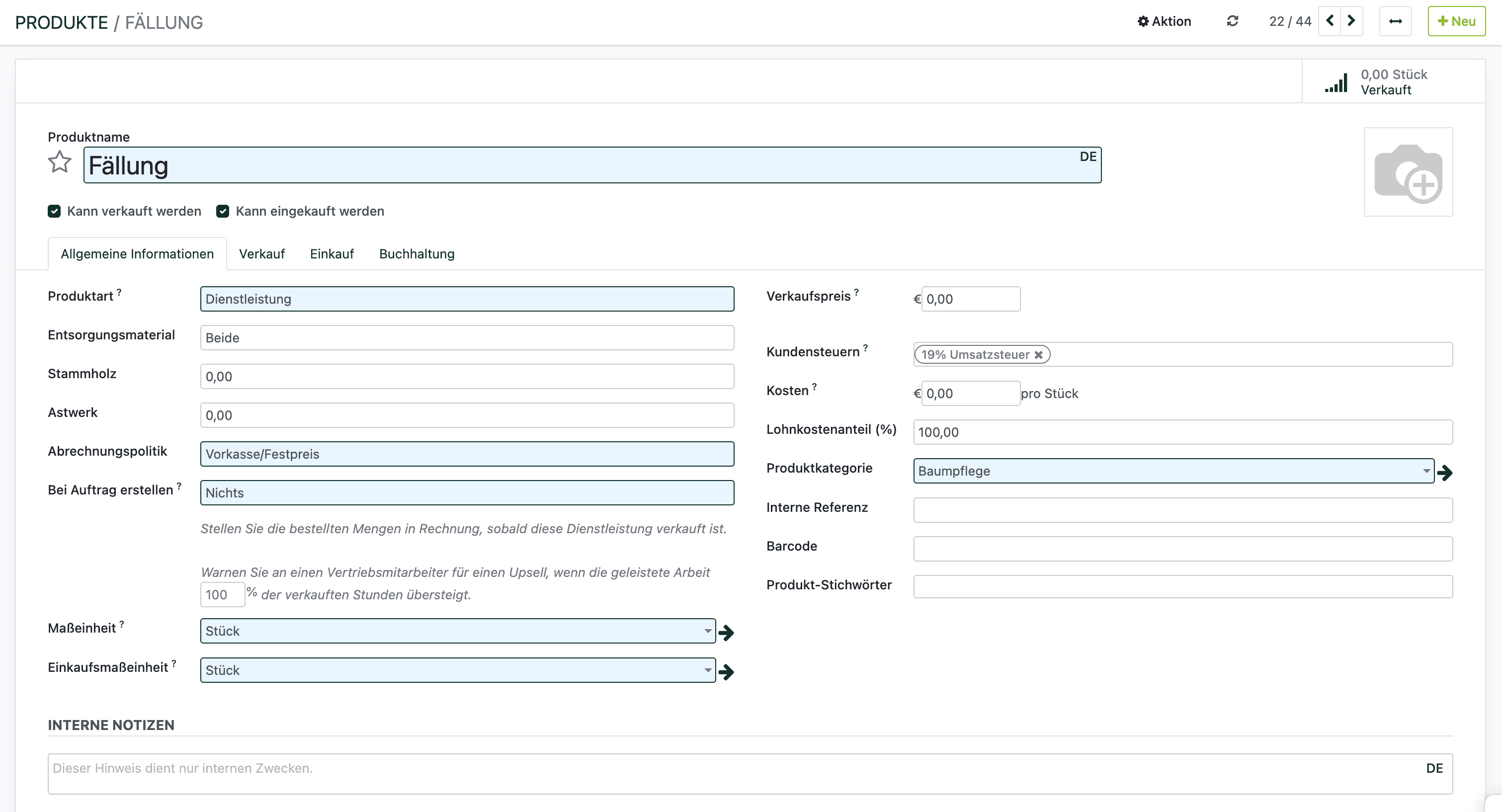 Das Prinzip ist einfach: Solange du keinen Lagerbestand für das Produkt pflegst, legst du es als Dienstleistung an. Das trifft auf nahezu alle Baumpflege-Produkte zu – inklusive Entsorgungspositionen und Artikel wie Kronensicherungen, die du in kleinen Mengen einkaufst.
