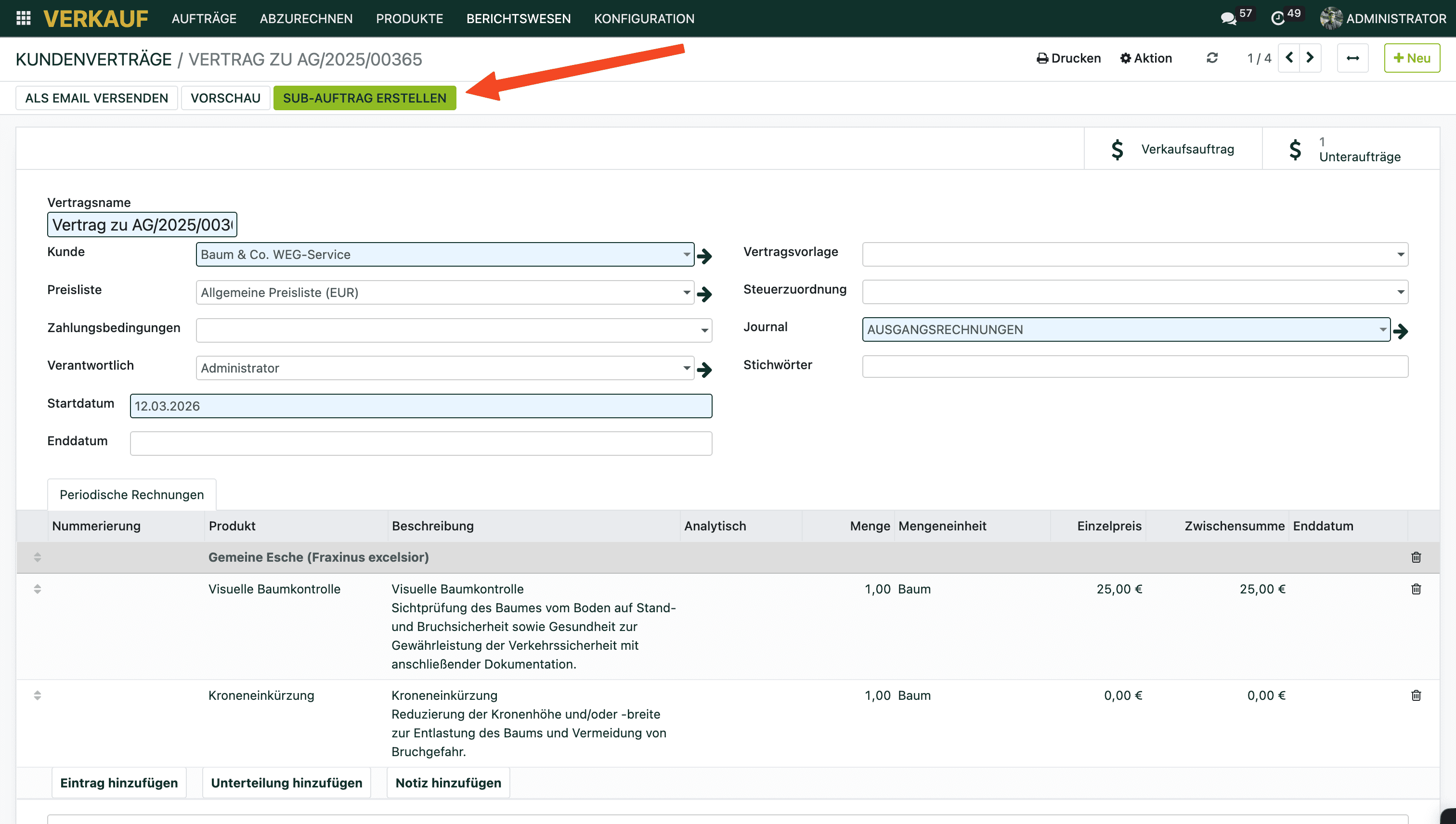 Öffne den Rahmenvertrag (über Verkauf → Aufträge → Verträge)