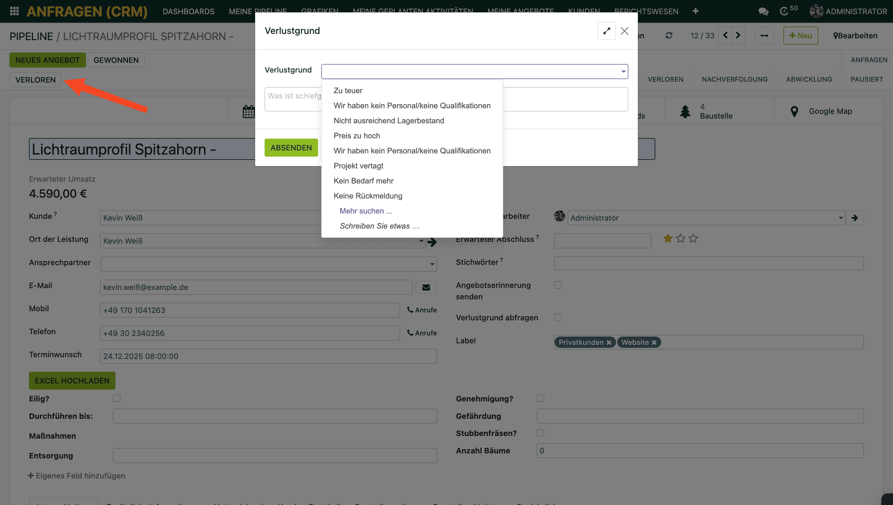 Wenn du weißt, warum Aufträge verloren gehen – z.B. „Preis zu hoch", „Kein Rückruf erhalten", „Auftrag an Mitbewerber" – kannst du gezielt gegensteuern. Die Verlustgrundabfrage sammelt diese Daten automatisch, ohne dass du extra eine Liste führen musst.