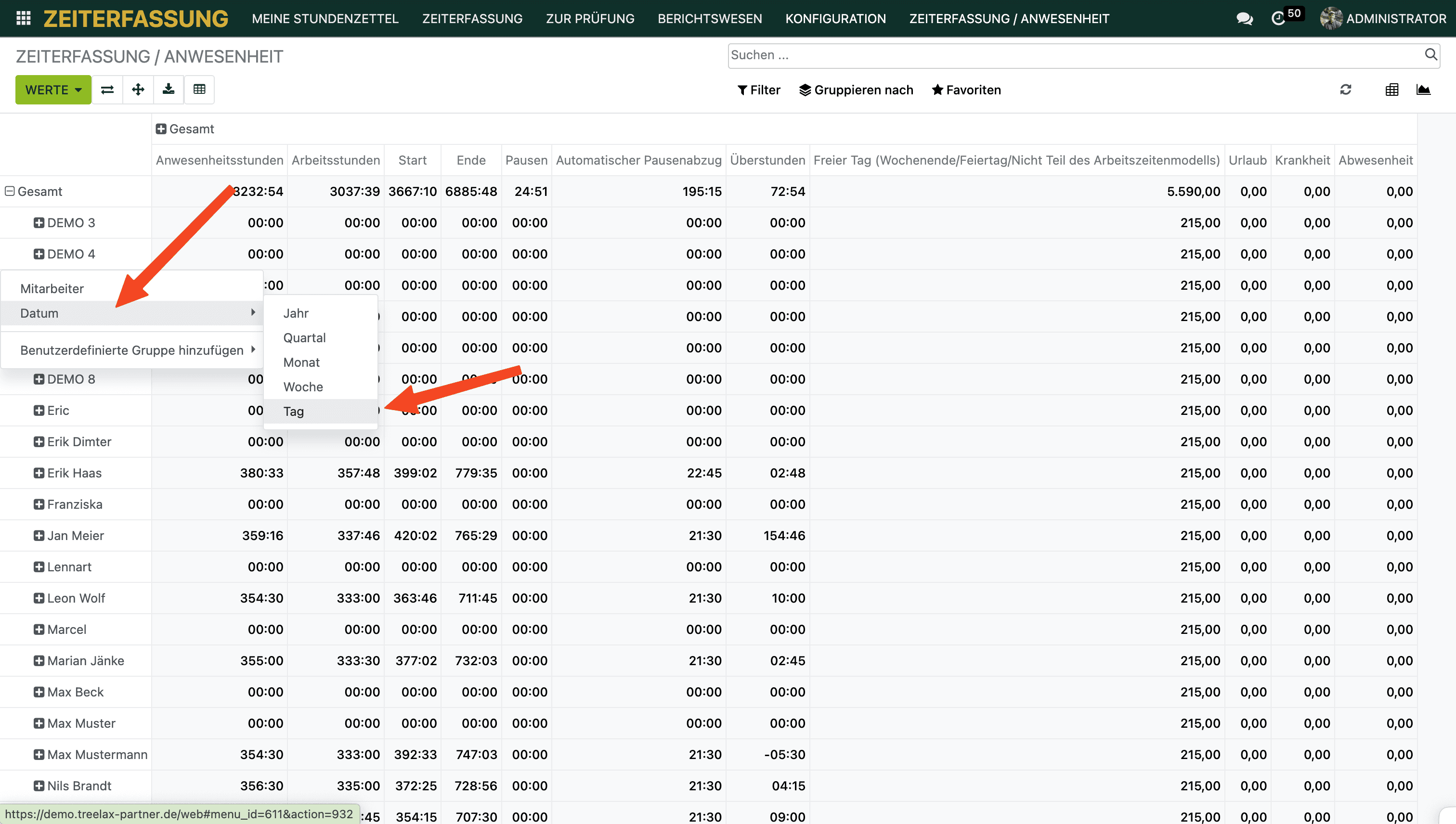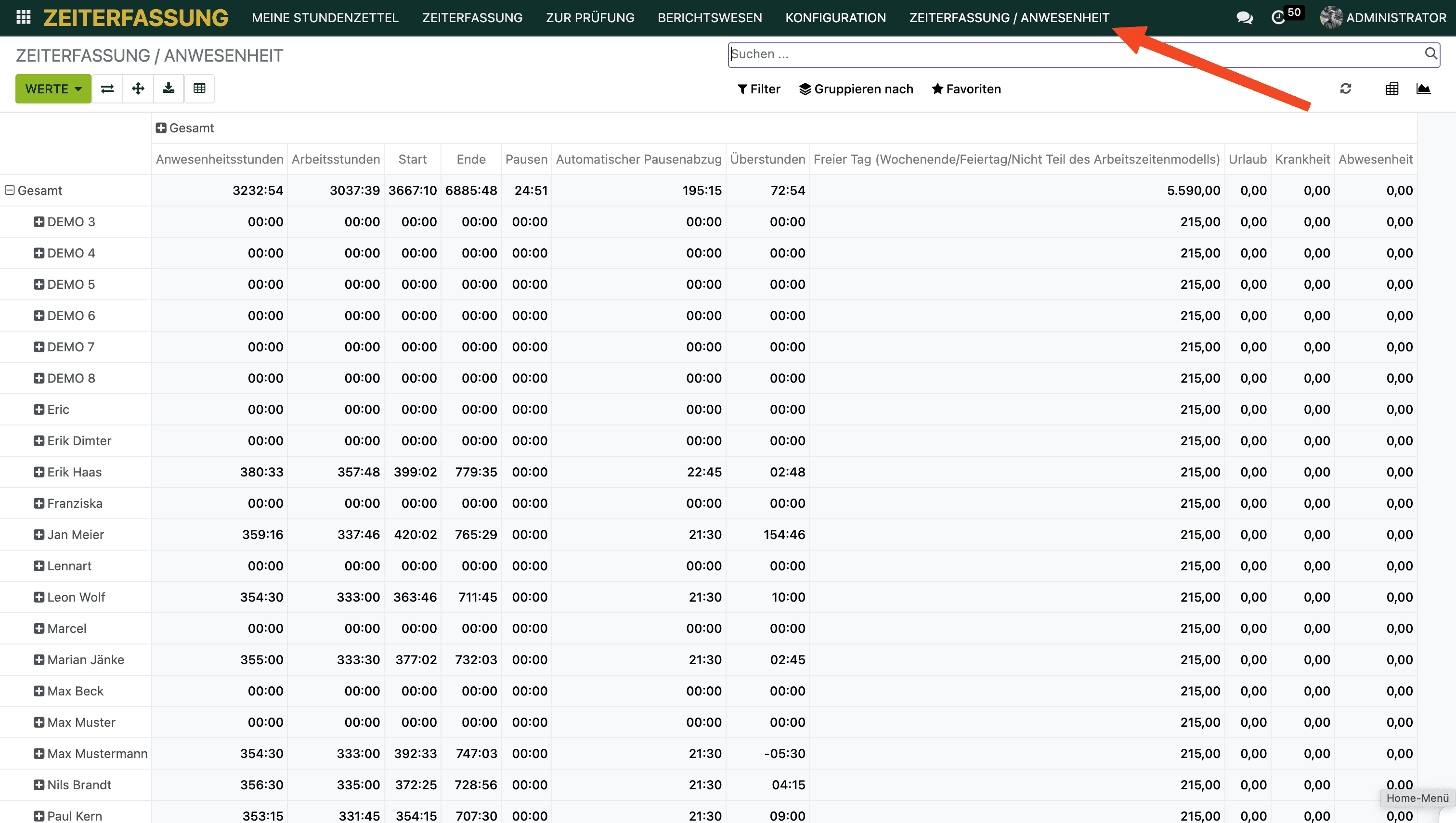 Klicke oben auf den Reiter Zeiterfassung/Anwesenheit.